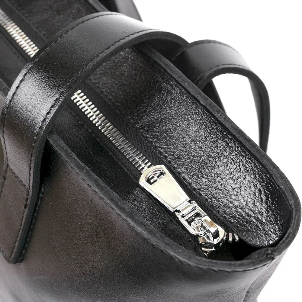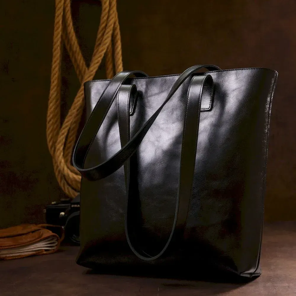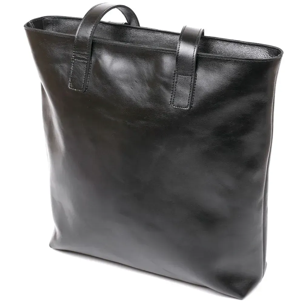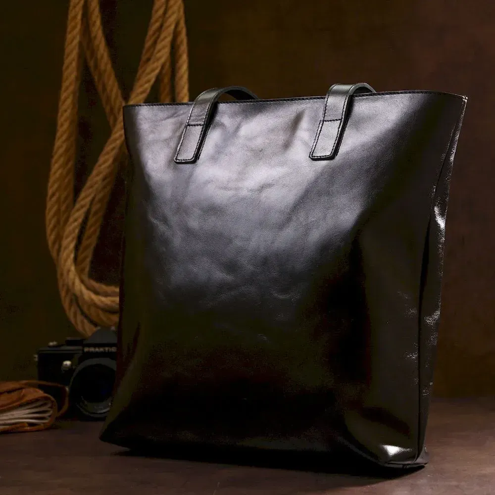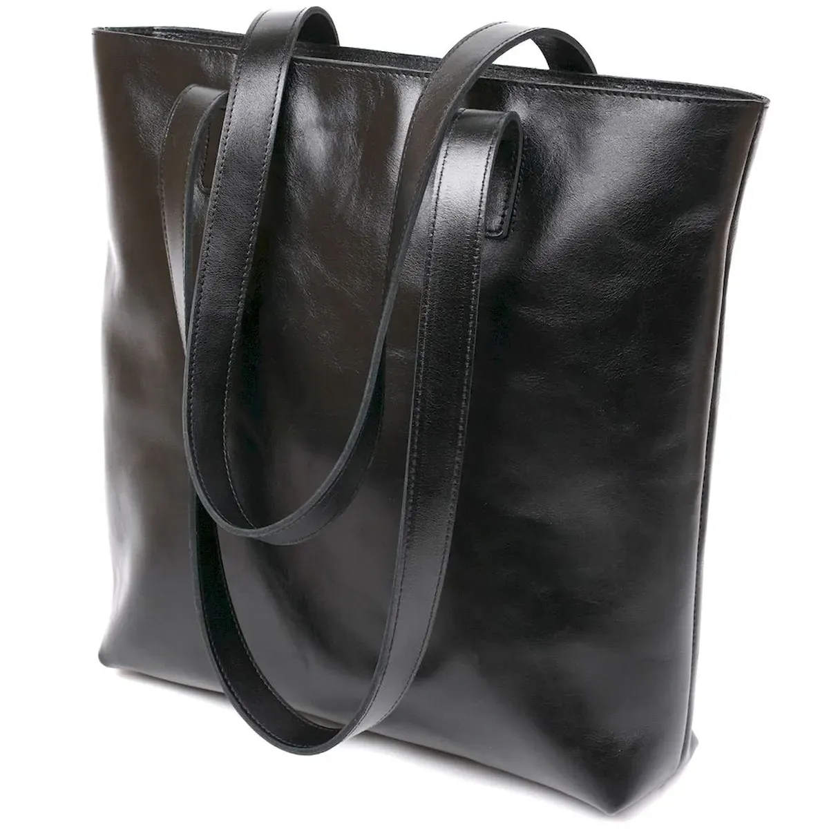 Містка сумка-шоппер стандартного розміру в універсальному чорному кольорі, тому чудово впишеться в гардероб будь-якої модниці. Виконана з натуральної міцної шкіри, якість якої видно навіть на відстані. Має одне просторе відділення та потайну кишеню на блискавці. Ручки зроблені також із щільної натуральної шкіри. Фактура – гладка і приємна на дотик.