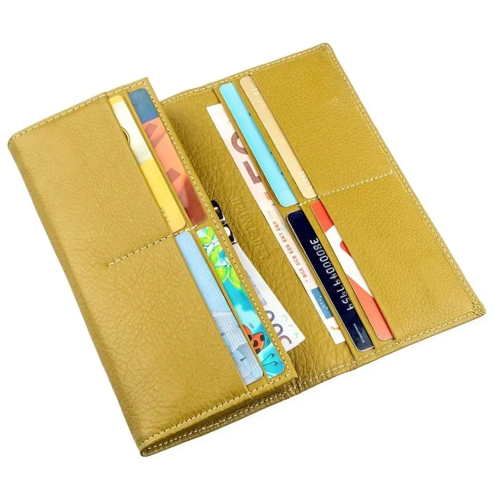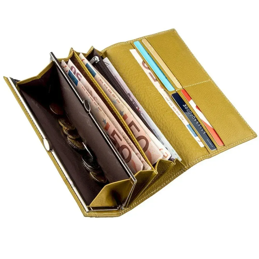 Гарний і екстравагантний жіночий гаманець незвичайного гірчичного кольору. Виконаний аксесуар із натуральної шкіри. Виглядає дуже модно та стильно. До того ж гаманець ще й дуже практичний, тому що має всі необхідні відділення та кишені для Ваших цінностей. Усередині є три основні великі відділення для купюр, відділення на блискавці для інших цінностей, кишені для всіляких карт та зручна монетниця на металевій клямці. Також є одне зовнішнє містке відділення. Закривається цей гаманець на зручні магніти, які розташовані з обох боків. Запаковано виріб у білу картонну коробку.