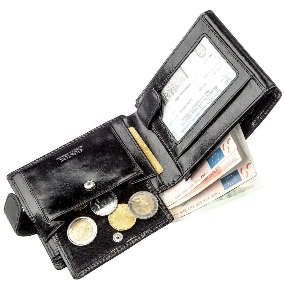 Класичний чоловічий гаманець із високоякісної шкіри чорного кольору. Має багато необхідних відділень для ваших карт, документів і, звичайно ж, грошей. Також цей виріб може похвалитися оптимальним розміром і елегантним дизайном, що не викликає, який підійде для чоловіків різного віку та соціального стану. Мати такий гаманець, захоче кожен, тому поспішайте купити цей гаманець собі чи подарунок. Запаковано цей виріб у міцну картонну коробку білого кольору.