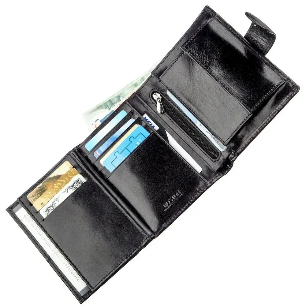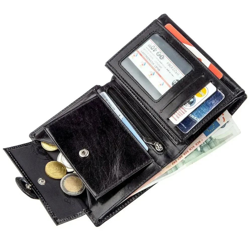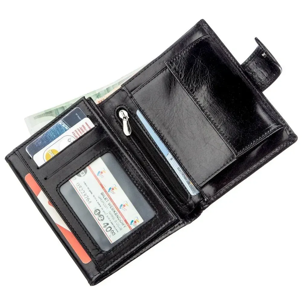 Класичний чоловічий гаманець з натуральної шкіри чорного кольору. Має всі необхідні відділення та кишені для ділової людини. Головною особливістю гаманця є його особлива практичність і зручність у використанні, він чудово лягає як у сумку або борсетку, так і в кишеню, не завдаючи ніякого дискомфорту. Виконаний у стриманому стилі для серйозних чоловіків будь-якого віку. Вирізняється високою якістю шкіри, яка обов'язково порадує Вас своєю довговічністю. Купивши цей аксесуар для себе або на подарунок, Ви гарантовано залишитеся дуже задоволені. Гаманець продається у твердій картонній фірмовій коробці.