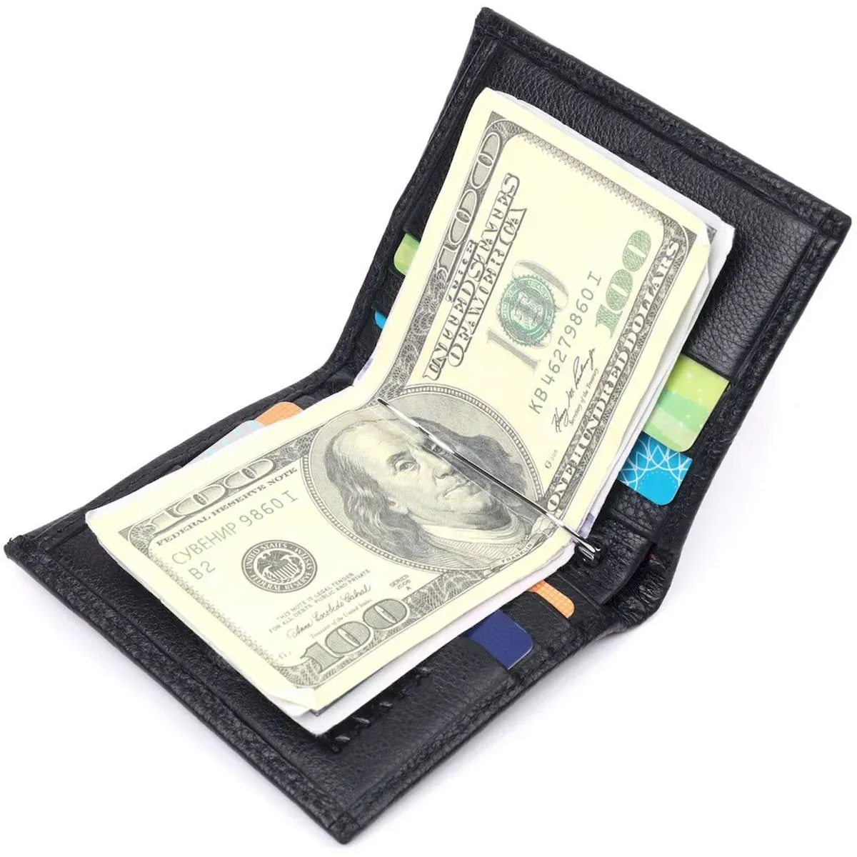 Класичний чоловічий затискач з натуральної шкіри, в чорному кольорі. Виріб закривається у два складання на магніт. На лицьовій стороні у вигляді декору розташований логотип виробника, а також для декору край затискача прошитий чорною ниткою. Аксесуар упакований у фірмову коробочку. Вироби з натуральної шкіри завжди будуть чудовим подарунком для близької людини.