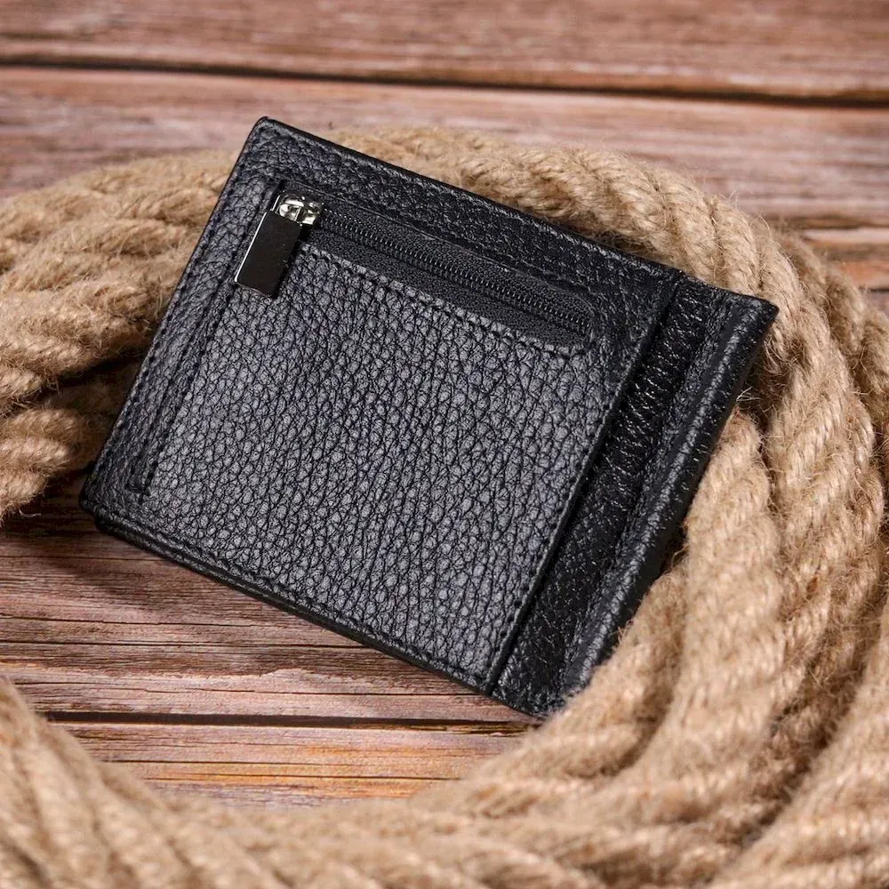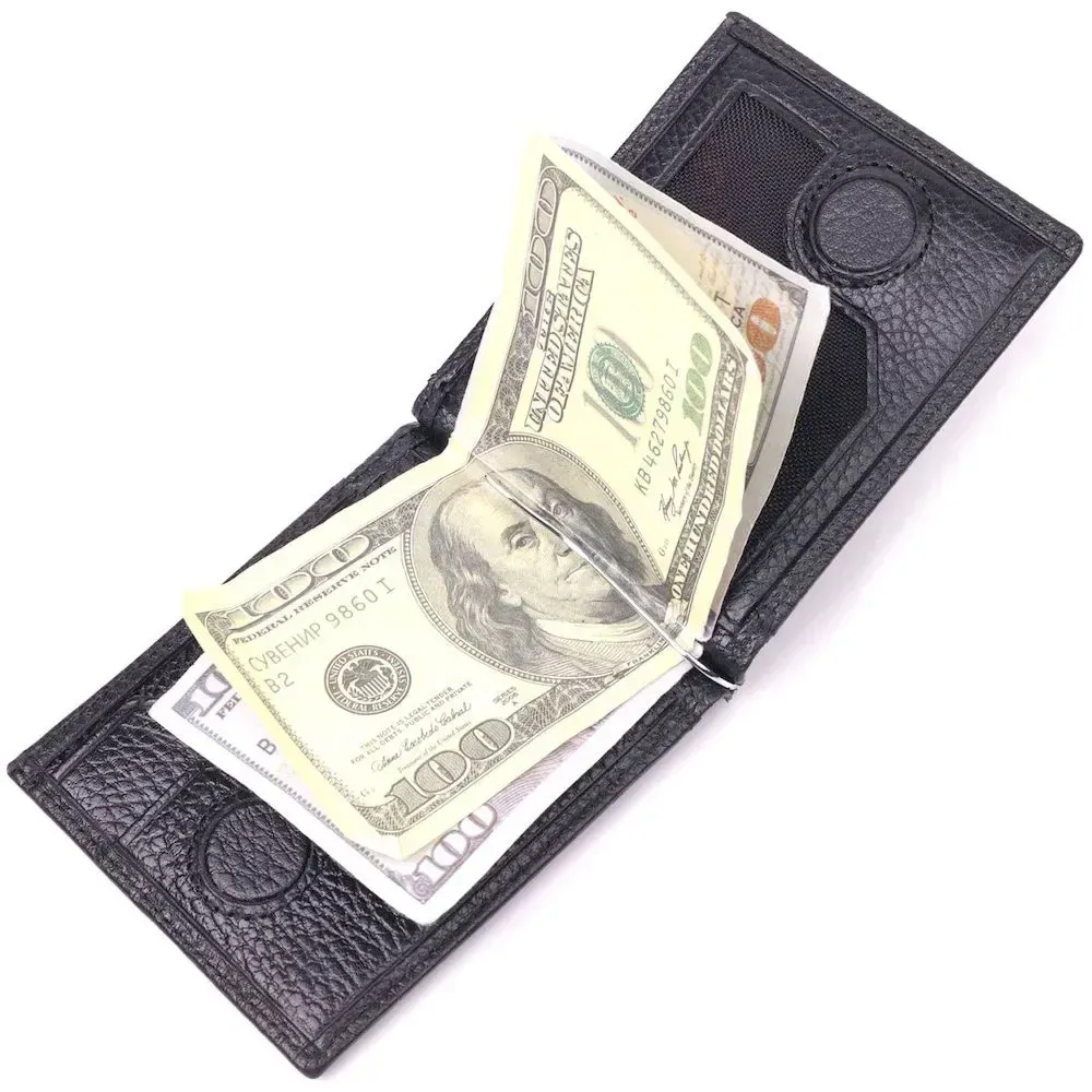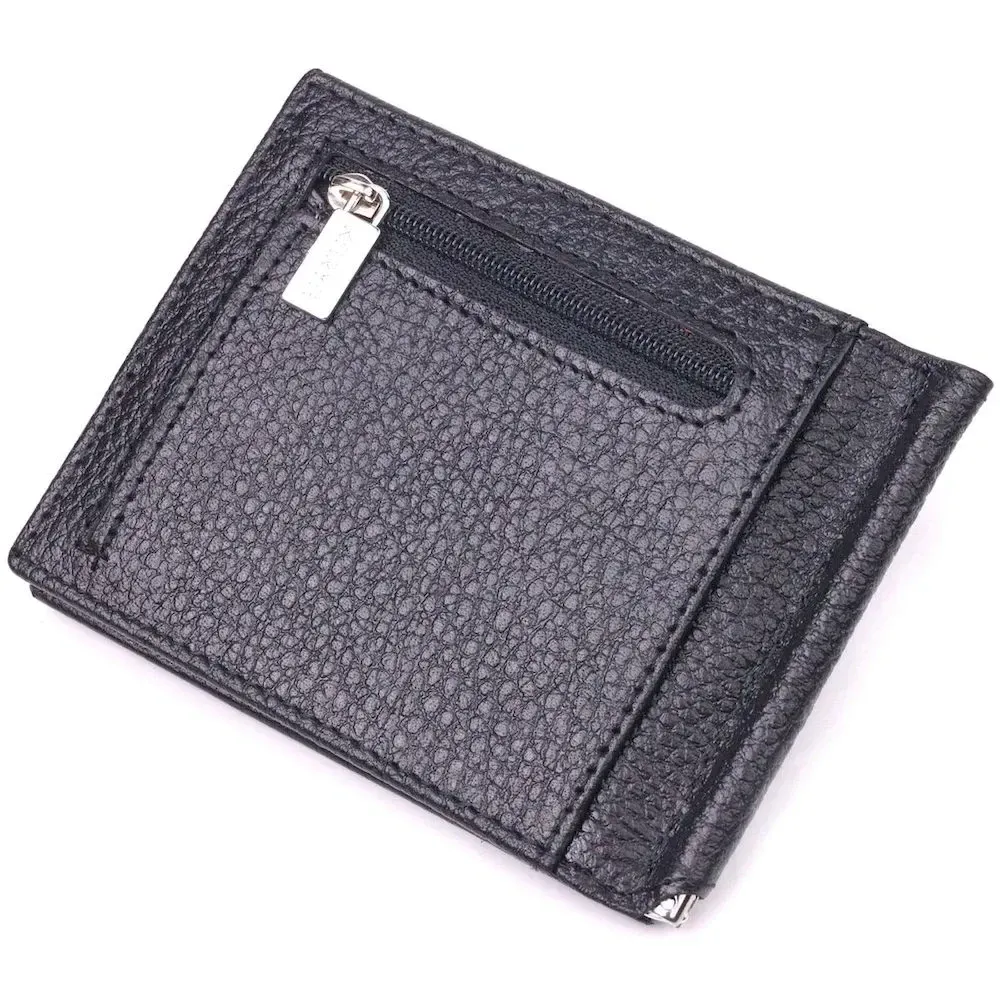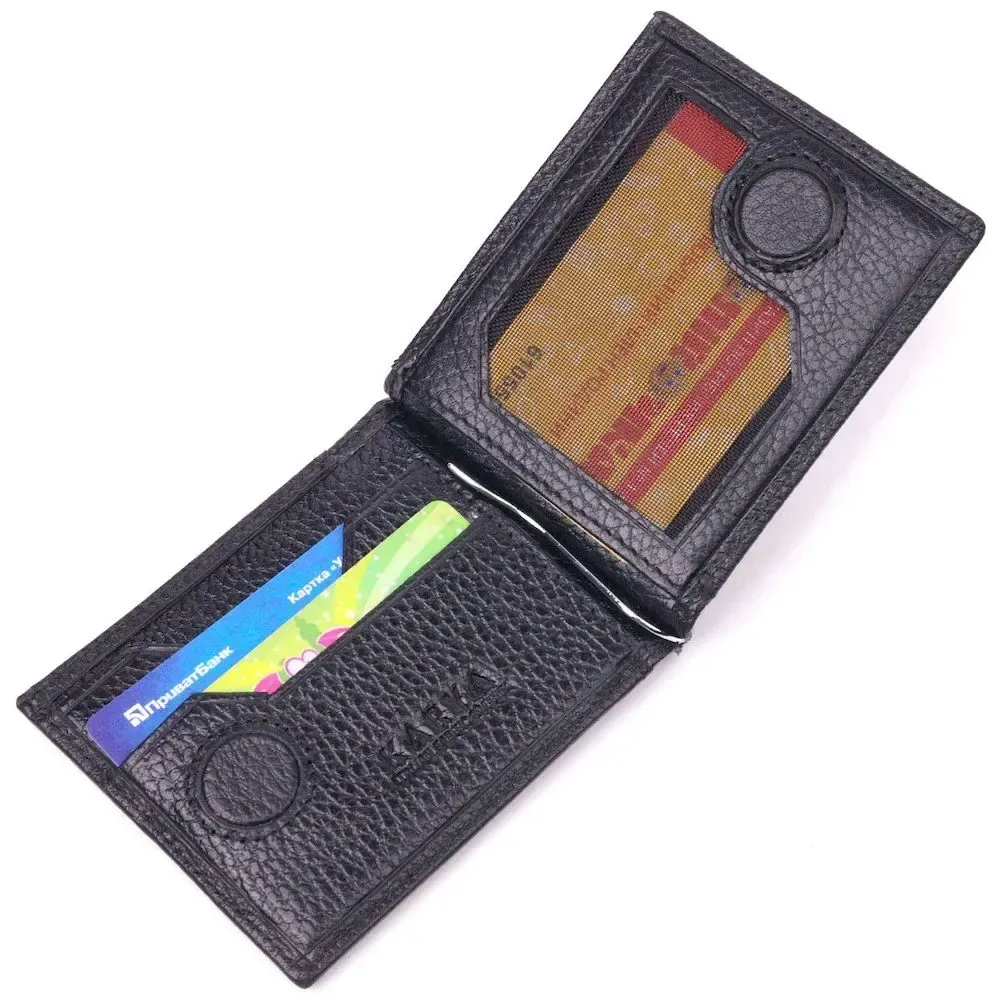 Чудовий чоловічий затискач з натуральної зернистої шкіри, в чорному кольорі. Виріб закривається у два складання на магніт. Затискач складається з металевого утримувача для купюр, трьох осередків для кредитних карток, трьох прилеглих кишень, відділення під сіточкою та монетниці, що закривається на блискавку. Аксесуар упакований у фірмову коробочку. Вироби з натуральної шкіри завжди будуть чудовим подарунком для близької людини.