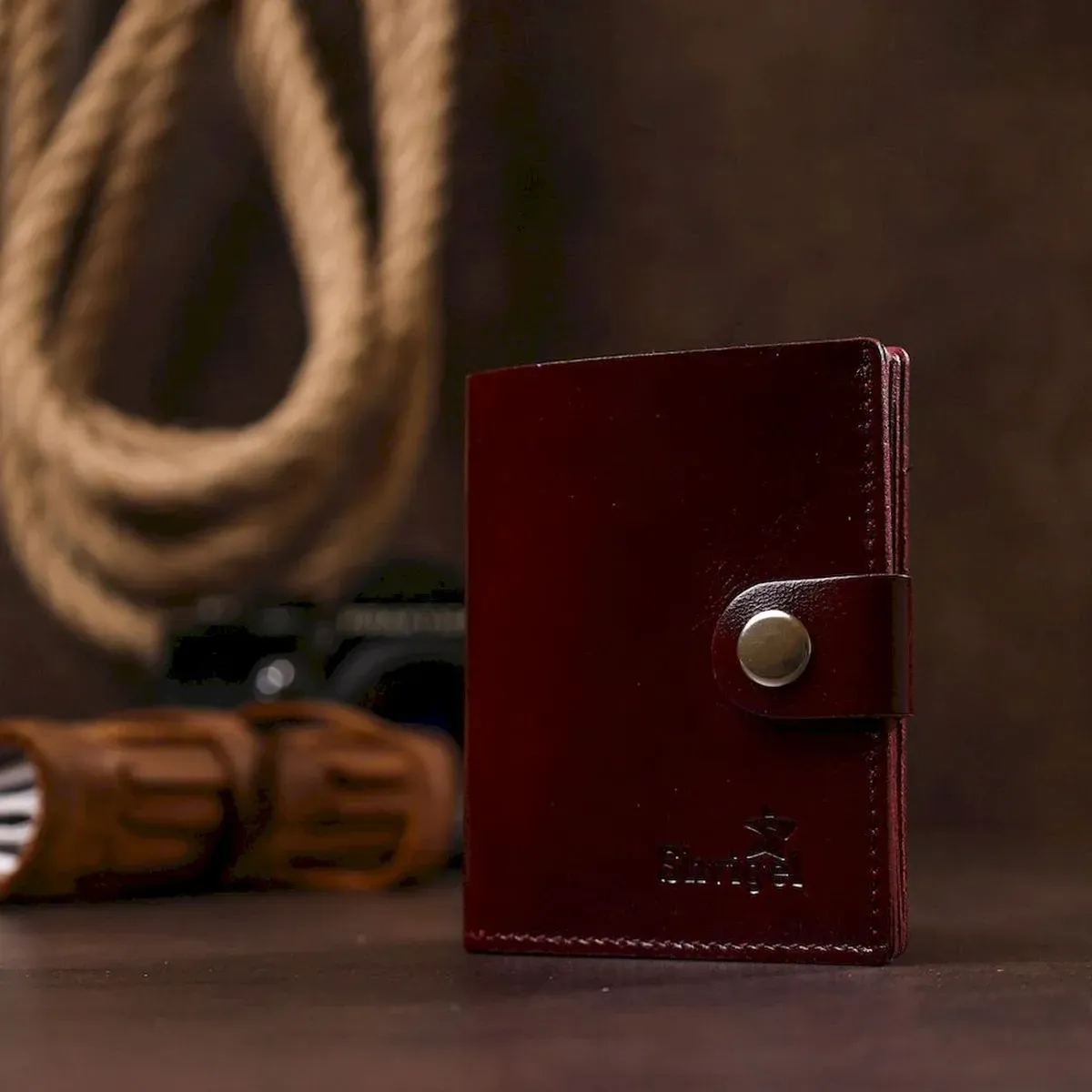 Класичне портмоне у строгому дизайні від українського виробника Виконано з натуральної висококласної шкіри з відмінними показниками зносостійкості та міцності. Усередині є містке відділення для купюр на всю довжину та кілька кишень для пластикових карток. Закривається аксесуар за допомогою шкіряного хлястика на кнопку.