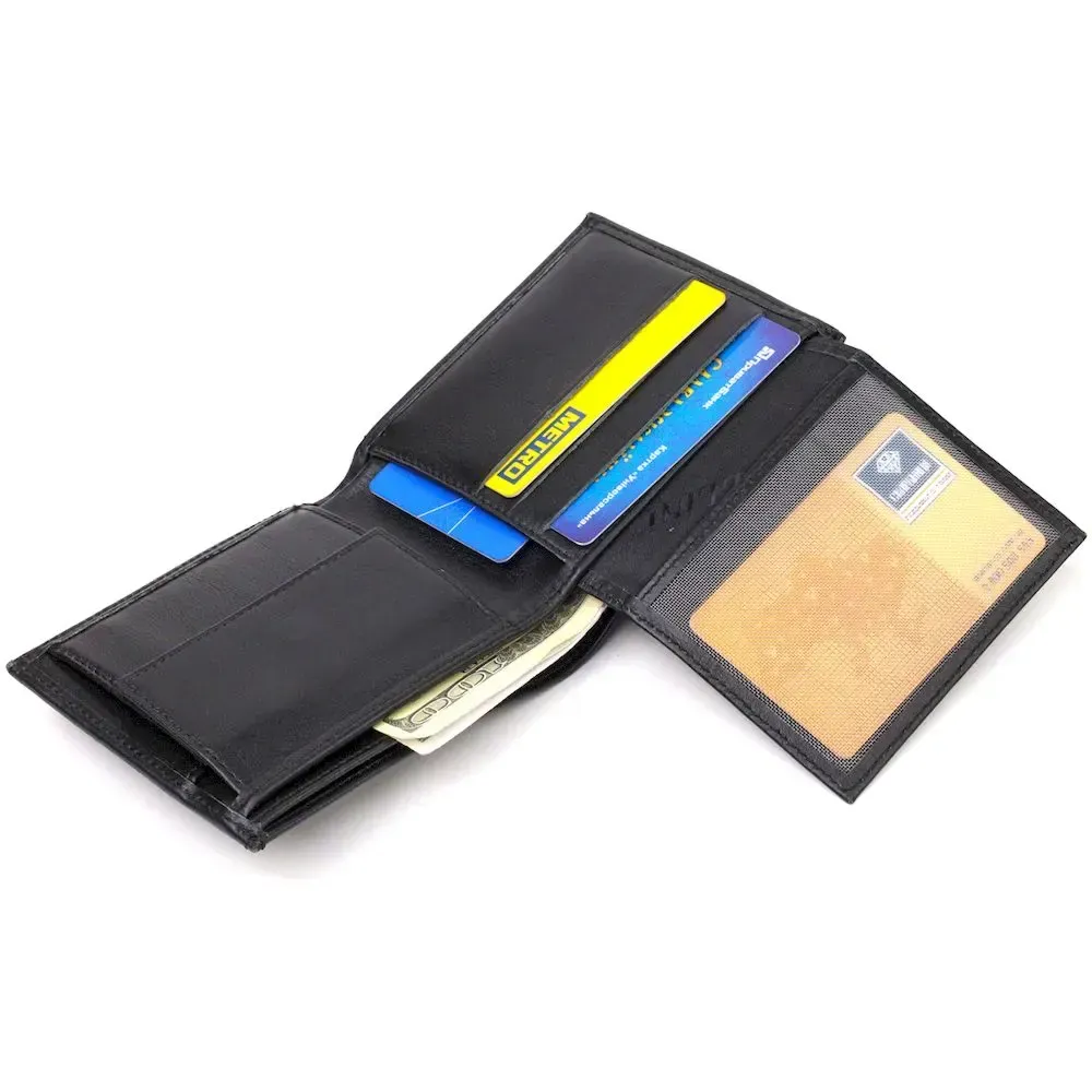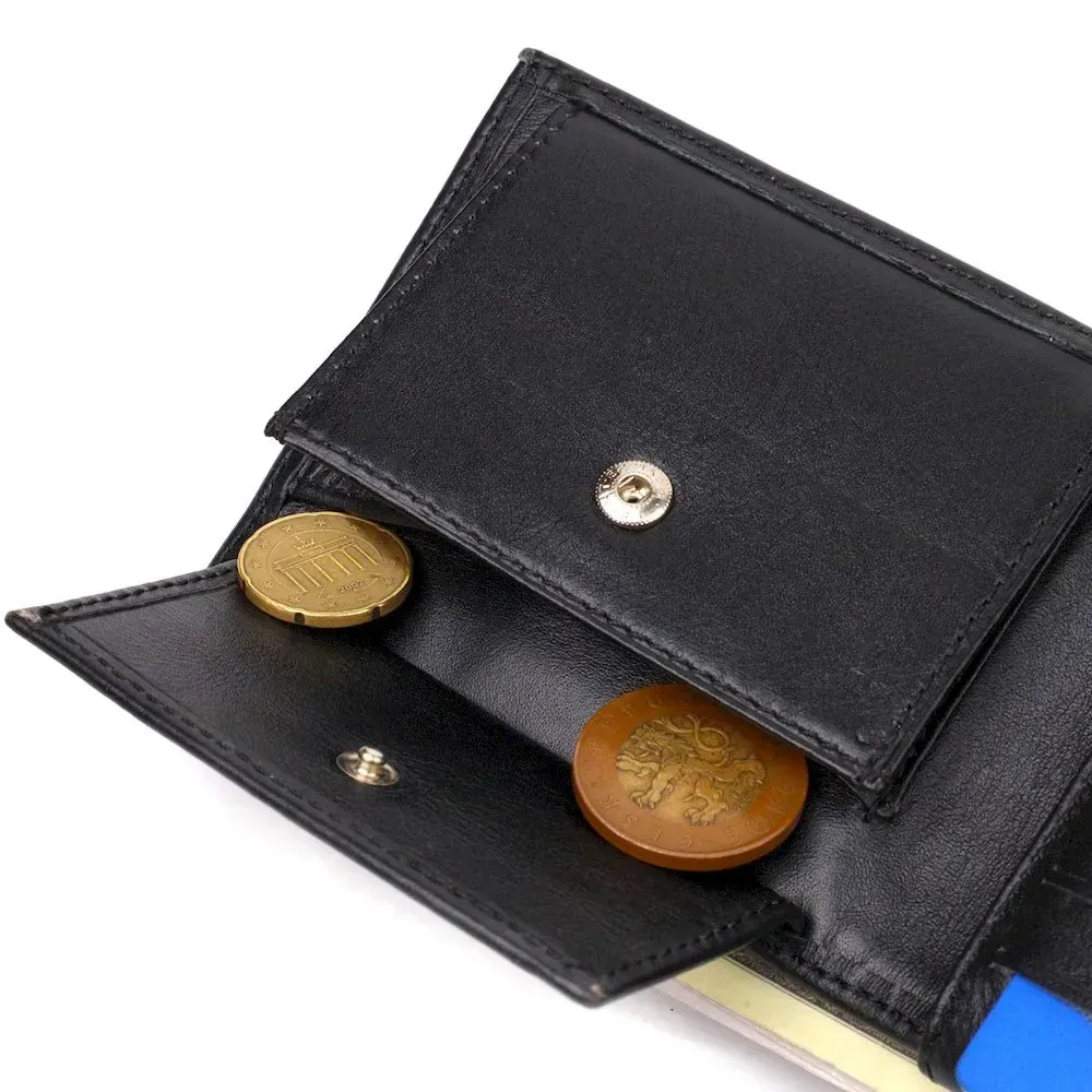 Класичний чоловічий гаманець із натуральної гладкої шкіри. Аксесуар має одне основне відділення з тканинною перегородкою, в яке поміщаються купюри всіх номіналів, шість кишень для карток, кишеня під сіточкою для пропуску, одна прихована кишеня і монетницю. Закривається аксесуар навпіл, без застібки. На лицьовій стороні, у правому нижньому куті металевий логотип компанії виробника. Купуючи шкіряний аксесуар цієї фірми, собі або на подарунок, будьте певні, що він прослужить Вам не один рік.