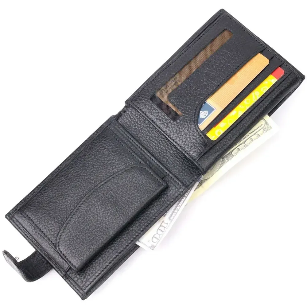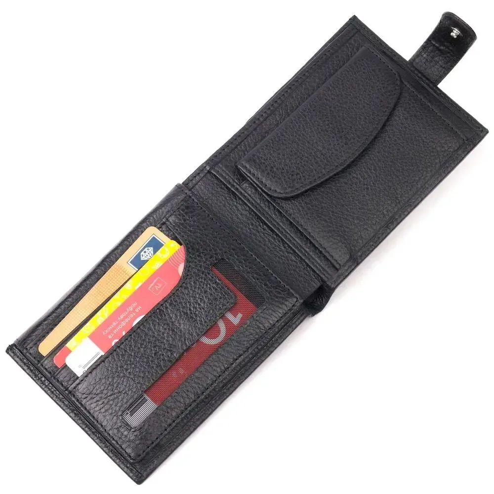 Відмінний чоловічий гаманець з натуральної шкіри, у класичному чорному кольорі. Виріб закривається хлястиком на кнопку. Виріб має місткі відділення для купюр і всередині достатньо осередків для кредиток. Виріб упакований у фірмову коробочку. Вироби з натуральної шкіри завжди будуть чудовим подарунком для близької людини.