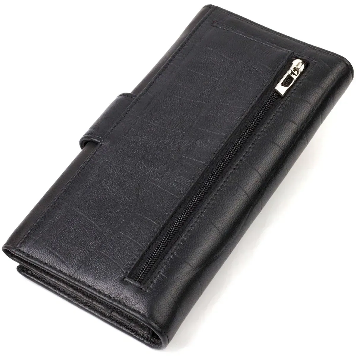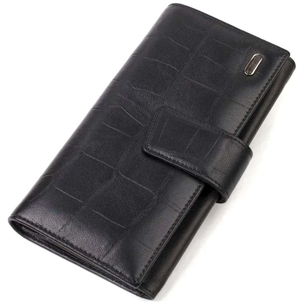 Місткий чоловічий гаманець-клатч з натуральної шкіри з тисненням під рептилію. Аксесуар має одне основне відділення з тканинною перегородкою на блискавці, вісімнадцять кишень для карток, кишеню під сіточкою для пропуску, дві приховані кишені та монетницю. Закривається аксесуар у дві додавання хлястиком на кнопку. На лицьовій стороні, у правому нижньому куті металевий логотип компанії виробника. Купуючи шкіряний аксесуар цієї фірми, собі або на подарунок, будьте певні, що він прослужить Вам не один рік.