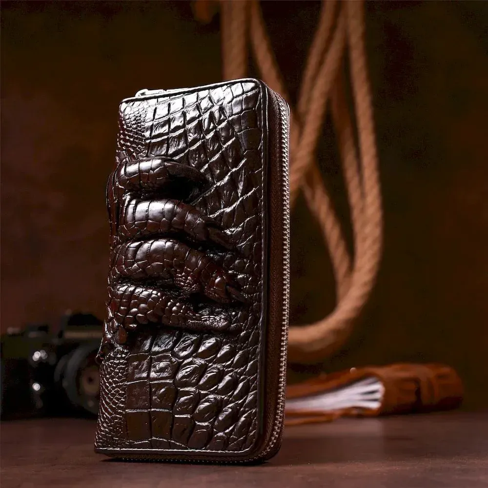 Якісний   ;преміум гаманець з натуральної шкіри крокодила. Модель має незвичайну структуру та неповторний візерунок, виготовлена з хвостової частини. Фурнітура у виробі сріблястого кольору та високої якості. Вироби із крокодила вважаються розкішшю. Гаманець має родзинку на зовнішній стороні об'ємна лапа з пазурами. Достатньо місткий гаманець на кожен день. Виділить ваш статус, а оригінальний дизайн не залишиться непоміченим перехожим. Може бути чудовим подарунком. З таким гаманцем ви виглядатимете на всі 100.
