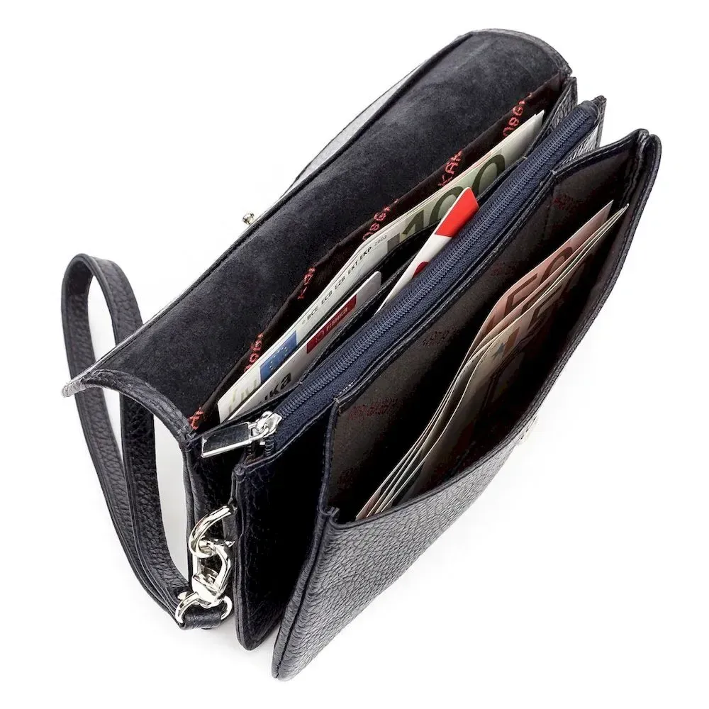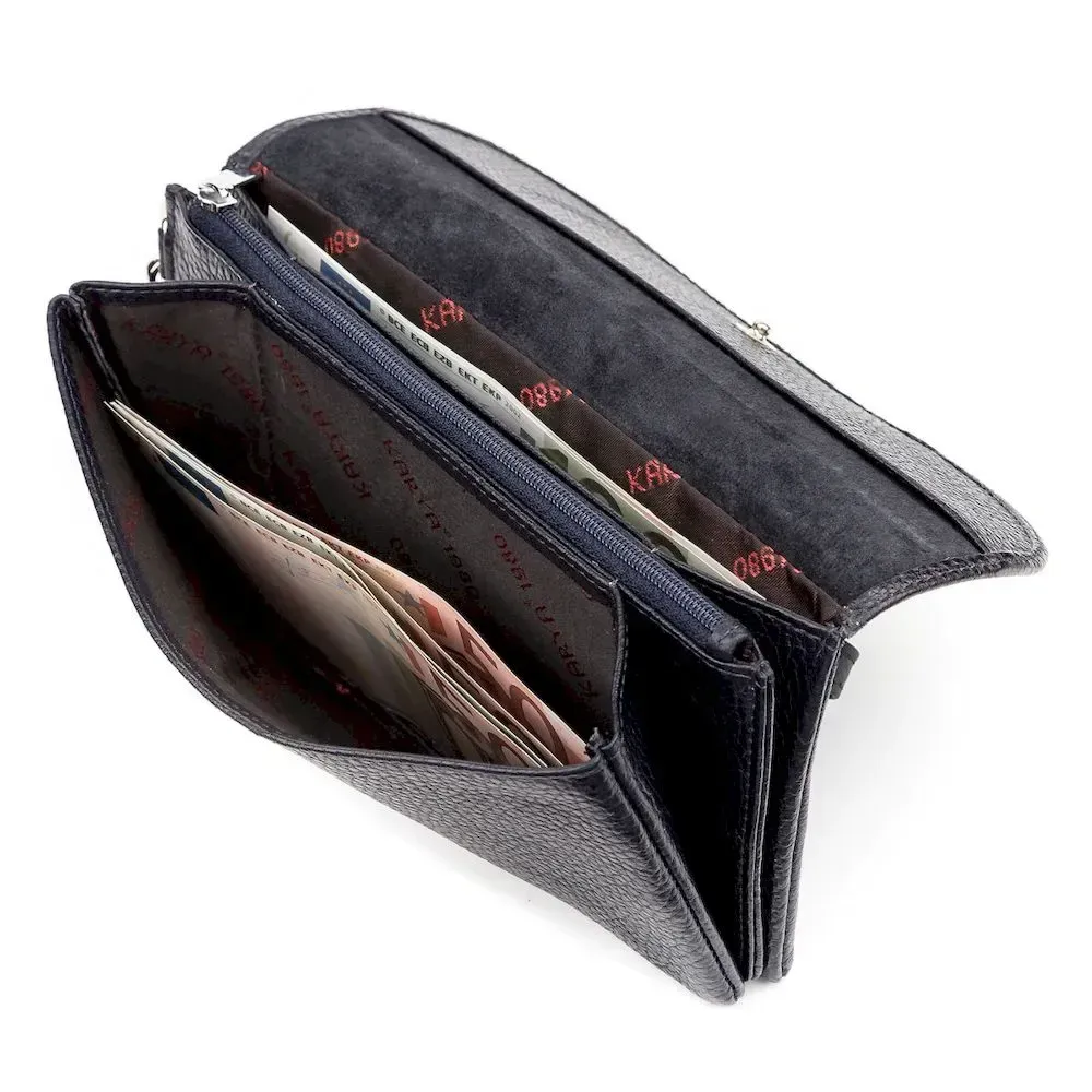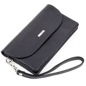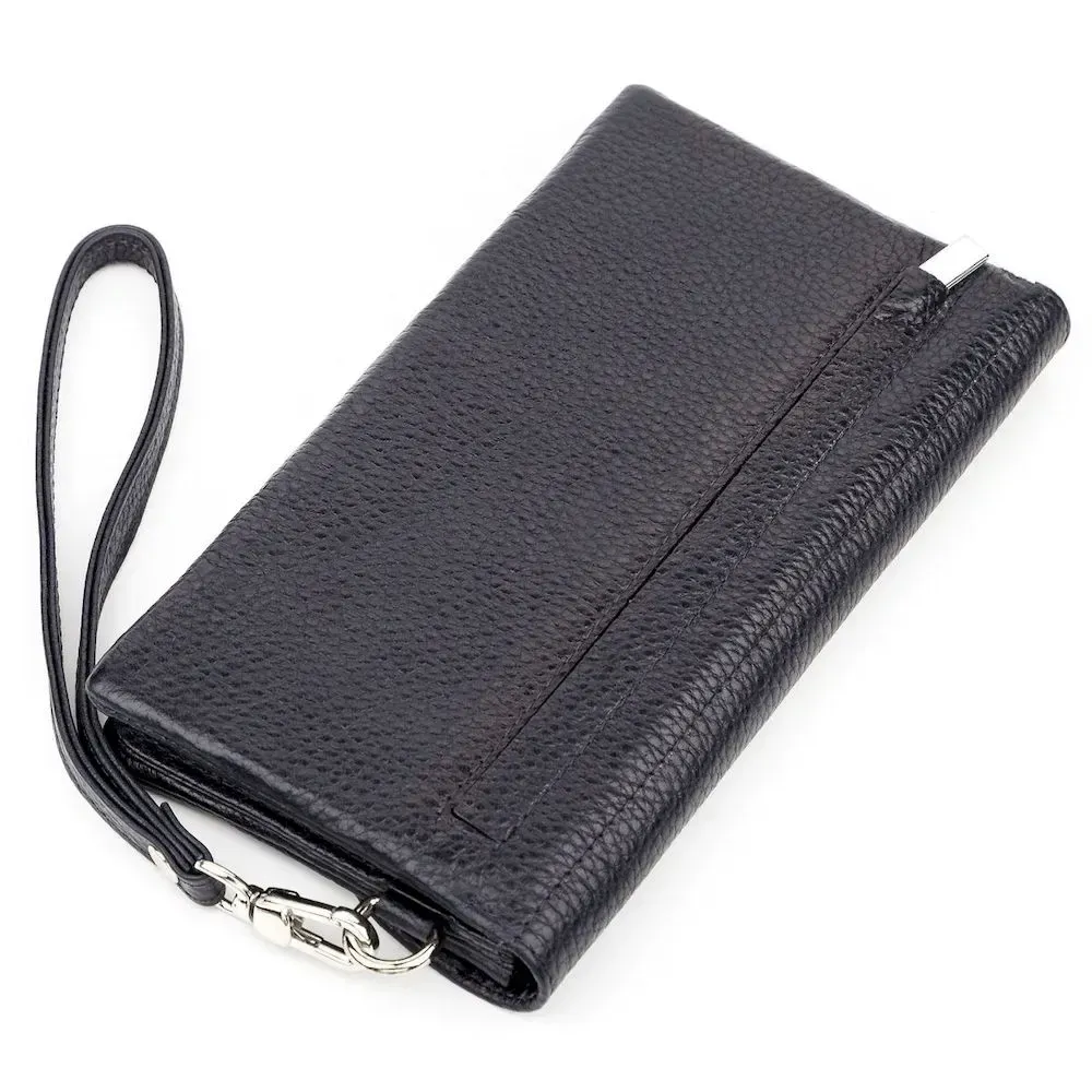 Місткий гаманець-клатч чорного кольору з натуральної фактурної зернистої шкіри. Аксесуар можна носити як на пензлі за допомогою ремінця, так і в руці. Такий гаманець дуже місткий, в нього легко вміщується мобільний телефон, документи та інші дрібниці. Виріб упакований у фірмову коробочку, так що вам не доведеться думати, у що запакувати свій подарунок.