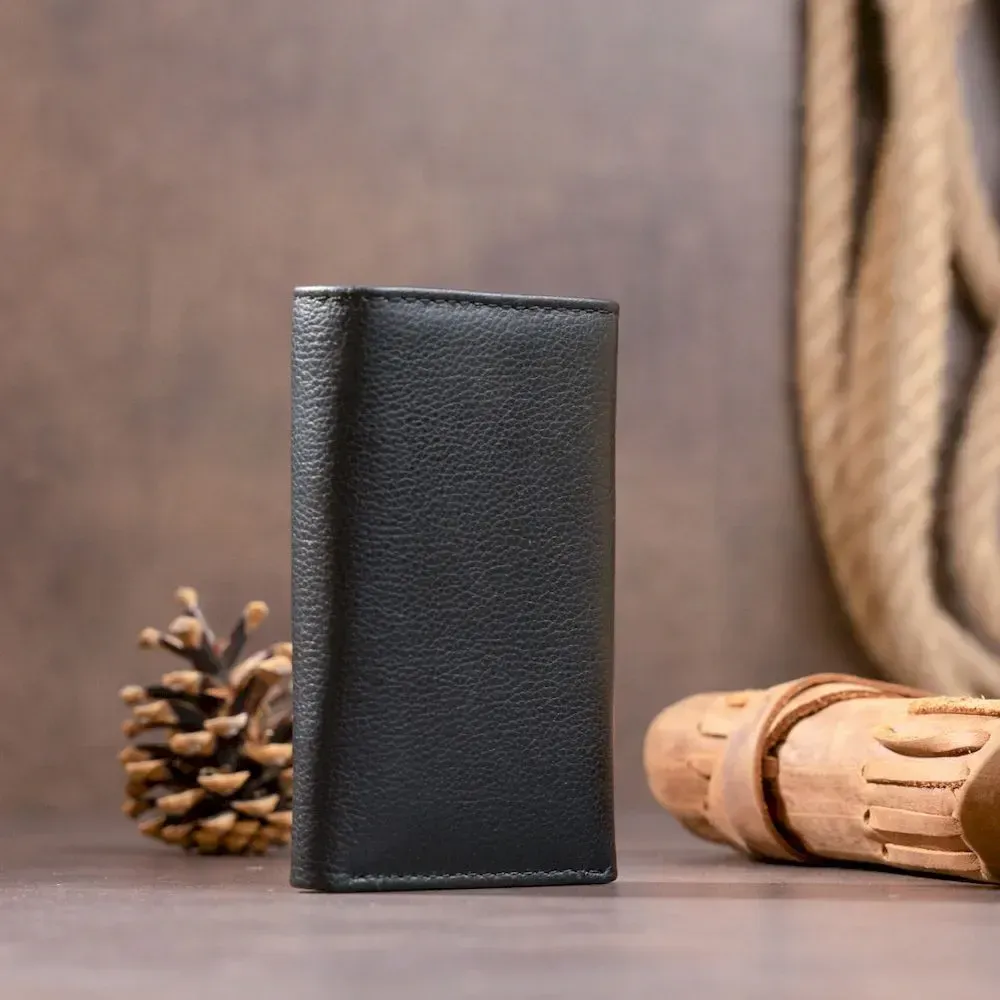 Універсальна ключниця практичного чорного кольору з натуральної шкіри. Якщо ви страждаєте від того, що ключі постійно рвуть ваші кишені – рекомендуємо вам цей аксесуар. Ключницю захищаємо від появи дірок. 6 карабінів усередині ключниці для стандартних ключів. Глибокий відділення для купюр і маленька кишенька для монет. Аксесуар вважається дуже практичним та універсальним та доступним. Шкіряна ключниця чудовий подарунок як для чоловіка, так і для жінки. Запаковано у фірмову коробку білого кольору.
