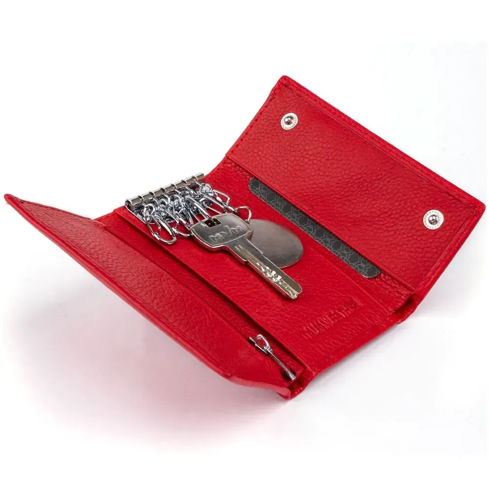 Яскравий гаманець-ключниця з натуральної шкіри червоного кольору. Виріб буде до душі будь-якій жінці. Виріб захищає ваші кишені від зношування та дірок, які з'являються від ключів. Модель має 6 карабінів для стандартних ключів. А також основне глибоке відділення для купюр та кишеньок на блискавці для монет. Маленькі габарити аксесуара роблять його ще більш практичним та універсальним. Закривається ключниця на дві кнопки. Прекрасно підійде на подарунок для жінки будь-якого віку. Запаковано у фірмову коробку білого кольору.