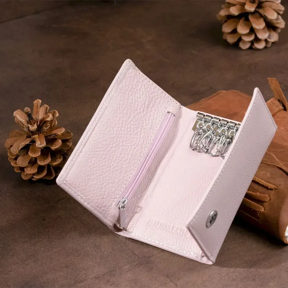 Стильний гаманець-ключниця для жінок зі шкіри високої якості яскравого та оригінального лілового кольору. Ліловий колір ключниці не залишиться непоміченим Аксесуар захищає ваші кишені від зношування та дірок, які з'являються від ключів. Модель має 6 карабінів для стандартних ключів. А також основне глибоке відділення для купюр та кишеньок на блискавці для монет. Маленькі габарити аксесуара роблять його ще більш практичним та універсальним. Завдяки своїм габаритам ключниця поміщається в кишеню або навіть найменшу чи бананку. Ви можете використовувати ключницю як 2 в 1: гаманець і власне ключниця. Закривається ключниця на дві кнопки. Прекрасно підійде на подарунок для жінки будь-якого віку. Запаковано у фірмову коробку білого кольору.