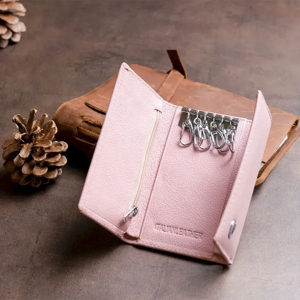 Чудовий гаманець-ключниця для жінок з натуральної шкіри високої якості ніжного рожевого кольору. Ключниця дуже зручна у використанні та захистить ваші кишені від дірок, які здатні зробити ключі. Аксесуар має повноцінне відділення для купюр, маленька кишенька на блискавці. У ключниці є шість карабінів для стандартних ключів. Даний гаманець легко поміститься в будь-яку навіть найменшу сумку чи кишеню. А також може використовуватись як самостійний аксесуар. Закривається ключниця на дві кнопки. Прекрасно підійде на подарунок для дівчини будь-якого віку. Запаковано у фірмову коробку білого кольору.