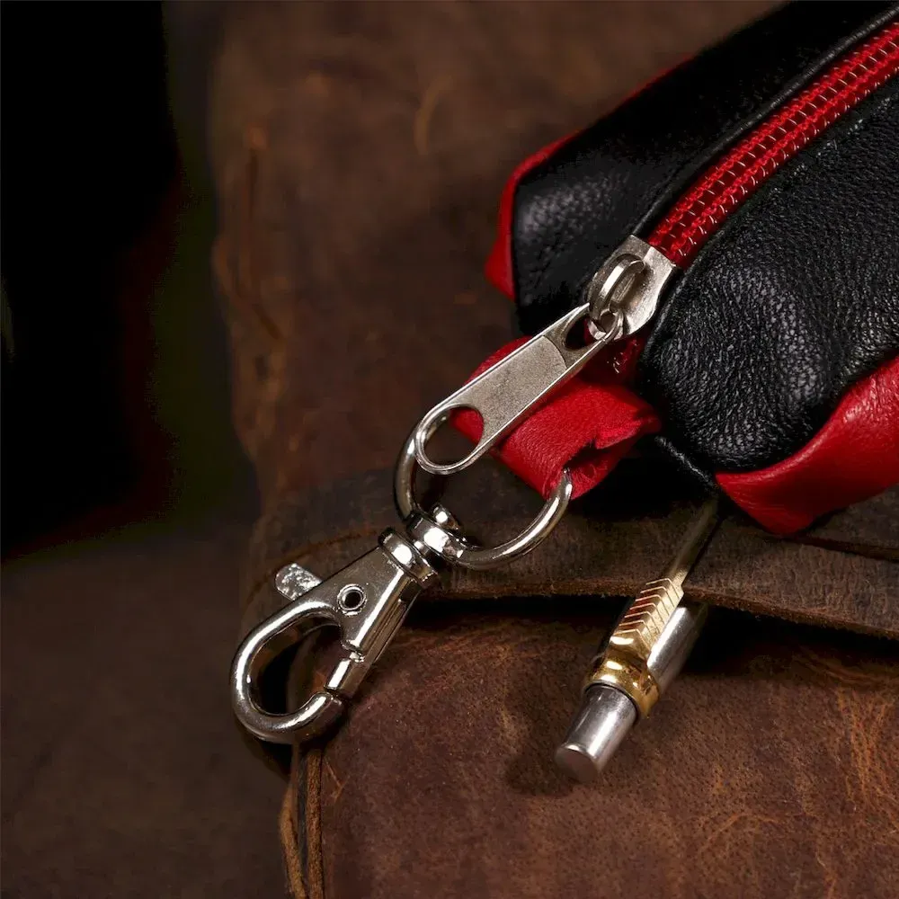 Оригінальне і дуже м'яка ключниця з натуральної шкіри буде просто знахідкою для тих хто втомився, що ключі рвуть підкладку в сумці або ваші кишені. З такою ключницею всі ключі будуть надійно знаходитися в одному місці. Якщо у вас ще немає ключниці – ви можете придбати її в нашому магазині. Ручна робота та висока якість, а також швидка доставка вас приємно здивують. У моделі є карабін, щоб зручно повісити на штани чи сумку. Аксесуар закривається на блискавку.