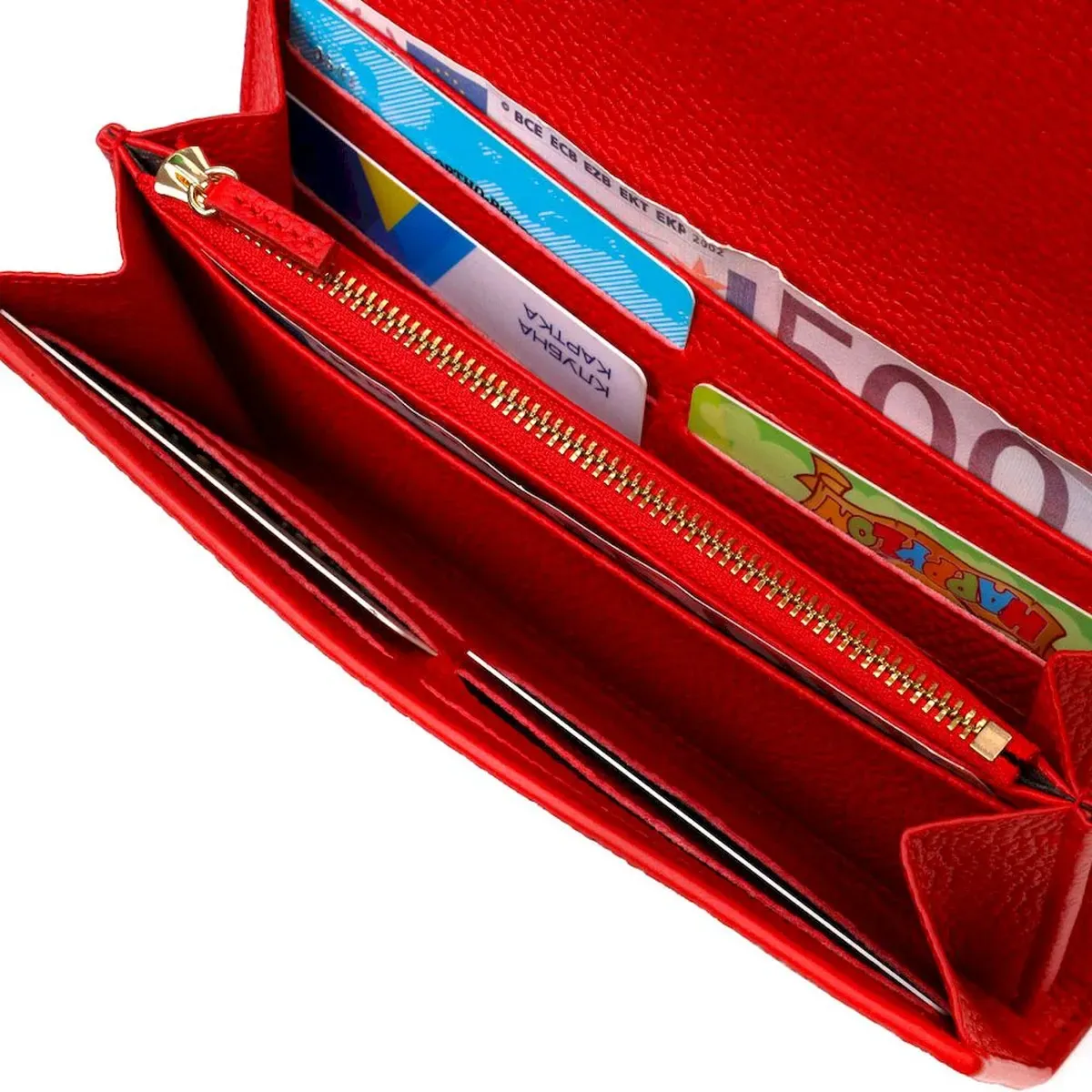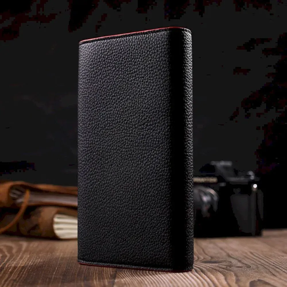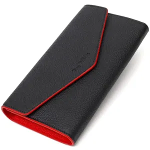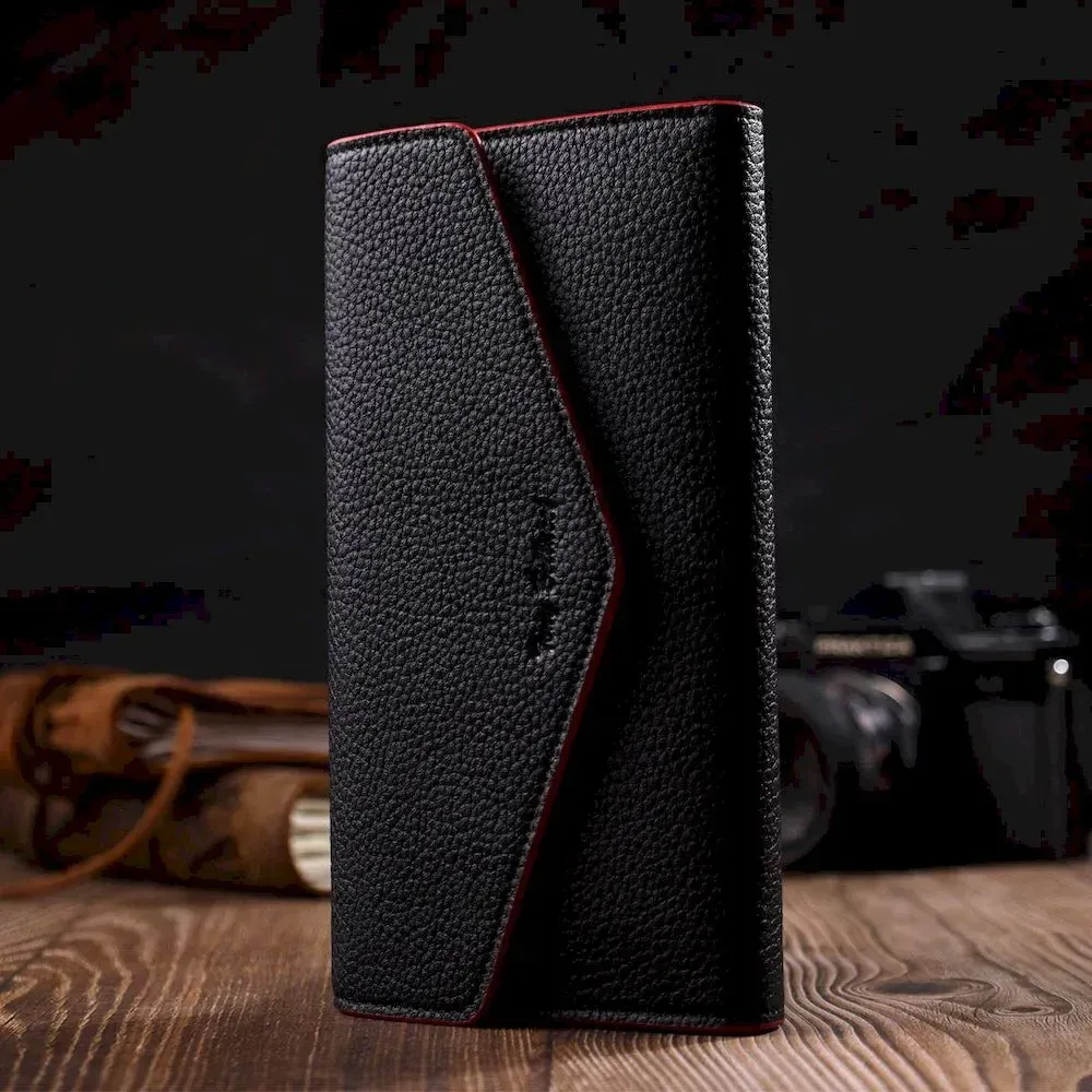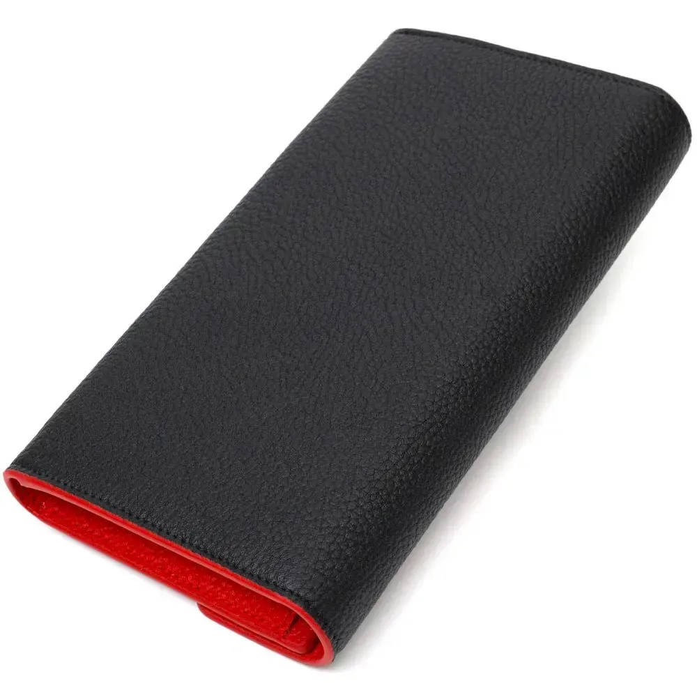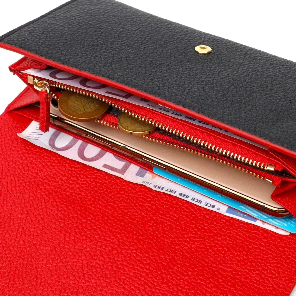 Стильний місткий жіночий гаманець з натуральної шкіри, у комбінації з двох кольорів чорного зовні та червоного всередині. Аксесуар складається з двох широких відділень для купюр, дванадцяти осередків для пластикових карток, двох прилеглих кишень та монетниці на блискавці. У виробі використано якісну фурнітуру золотистого кольору. Закривається гаманець трикутним клапаном на кнопку. Купуючи цей шкіряний гаманець, Ви не тільки набуваєте стильної речі, але й отримуєте якісний аксесуар, який прослужить не один рік.