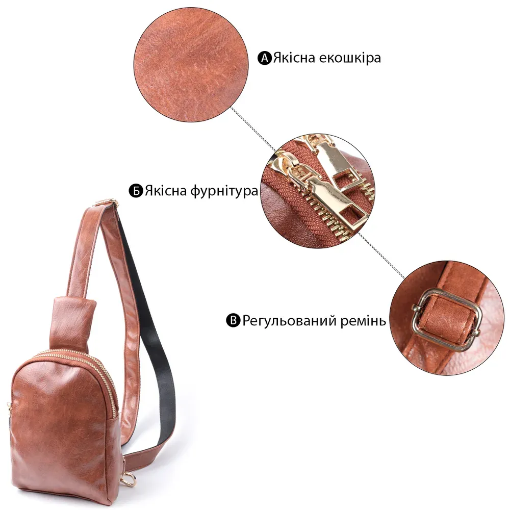 Прекрасна слінг сумка через плече з якісної екошкіри на два відділення. Акцентом даної моделі є зручний регульований плечовий ремінець у етнічному стилі, що дуже модно вже кілька сезонів. Екошкіра - високоякісна альтернатива натуральному матеріалу, яка дуже стійка до тертя, до низьких температур, відмінно носиться на відміну від інших штучних матеріалів, а також має гіпоалергенний склад на відміну від натуральної шкіри. Така сумка дуже зручна в експлуатації, оскільки речі завжди під рукою і у безпеці. Однозначно потішить кожну дівчину.