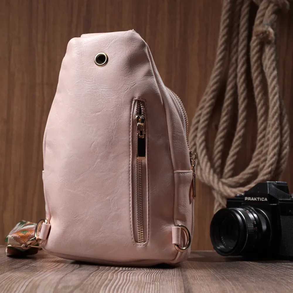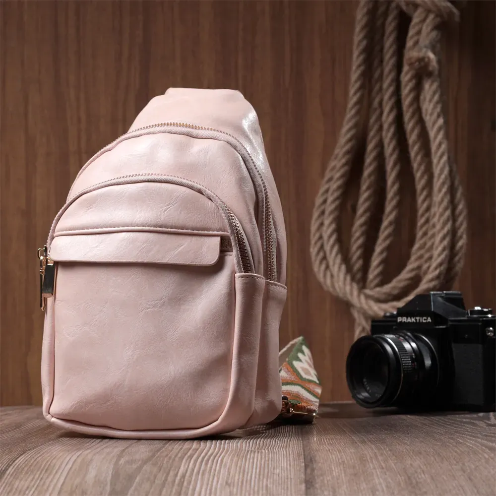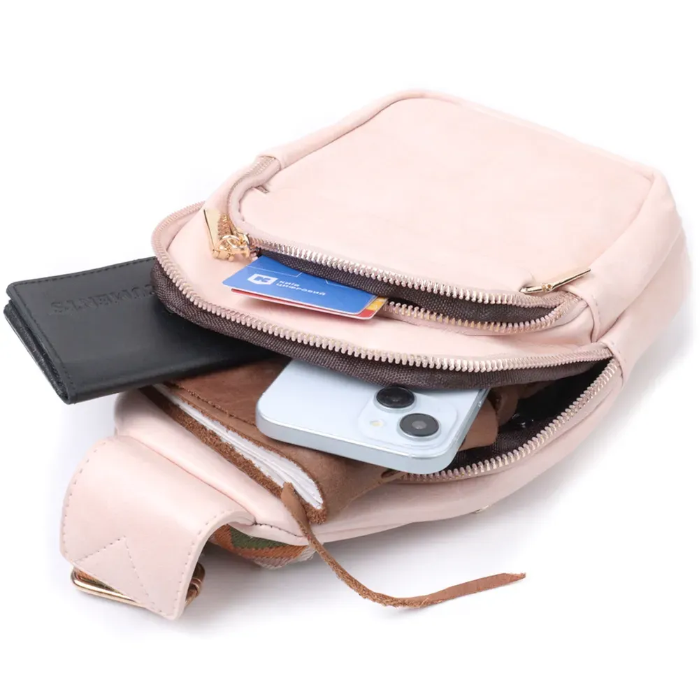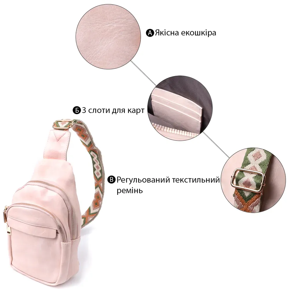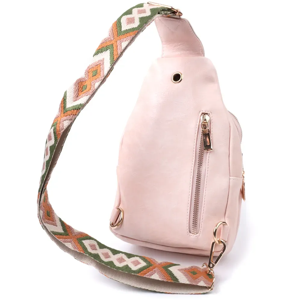 Компактна слінг сумка для жінок з гладкої екошкіри. Дана модель складається з одного основного відділення, яке закривається на блискавку і в якому знаходиться кишеня на блискавці і три кишені для кредитних карток усередині, а також трьох кишень зовні та одного отвору для кабелю або навушників, що дуже зручно в сучасному світі. Акцентом даної моделі є зручний регульований плечовий ремінець у етнічному стилі, що дуже модно вже кілька сезонів. Екошкіра - високоякісна альтернатива натуральному матеріалу, яка дуже стійка до тертя, до низьких температур, відмінно носиться на відміну від інших штучних матеріалів, а також має гіпоалергенний склад на відміну від натуральної шкіри.