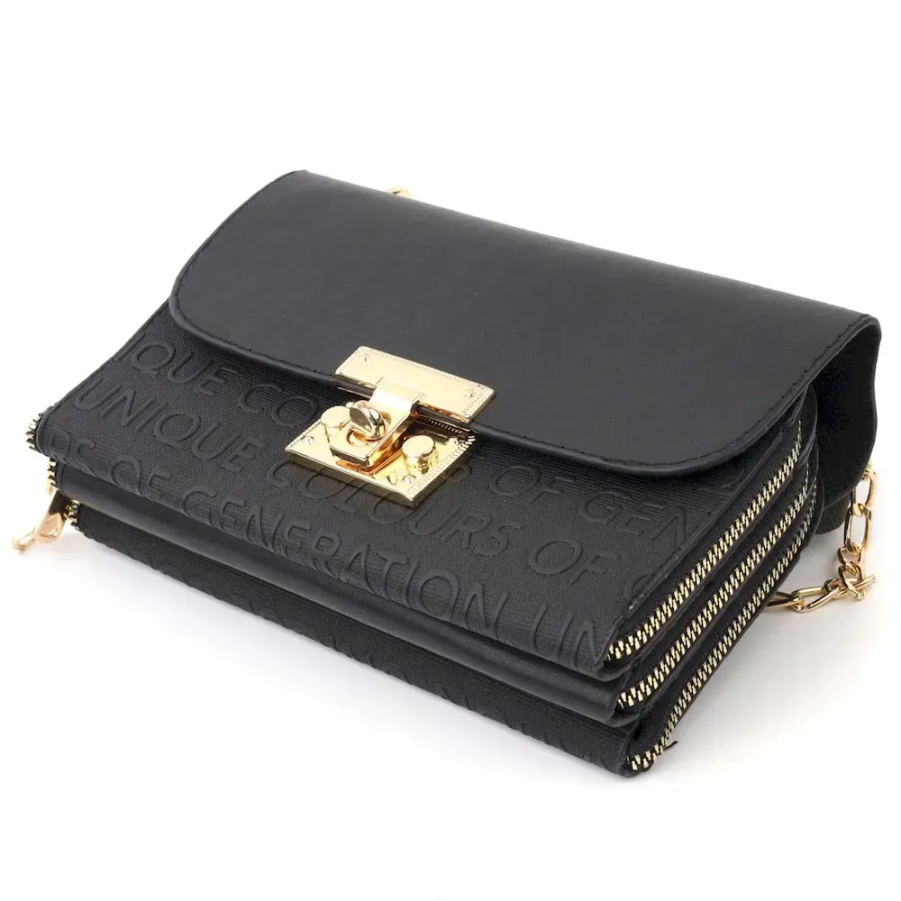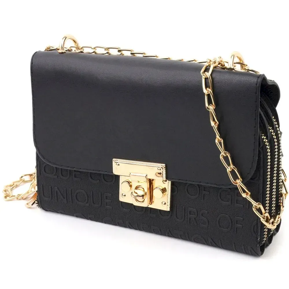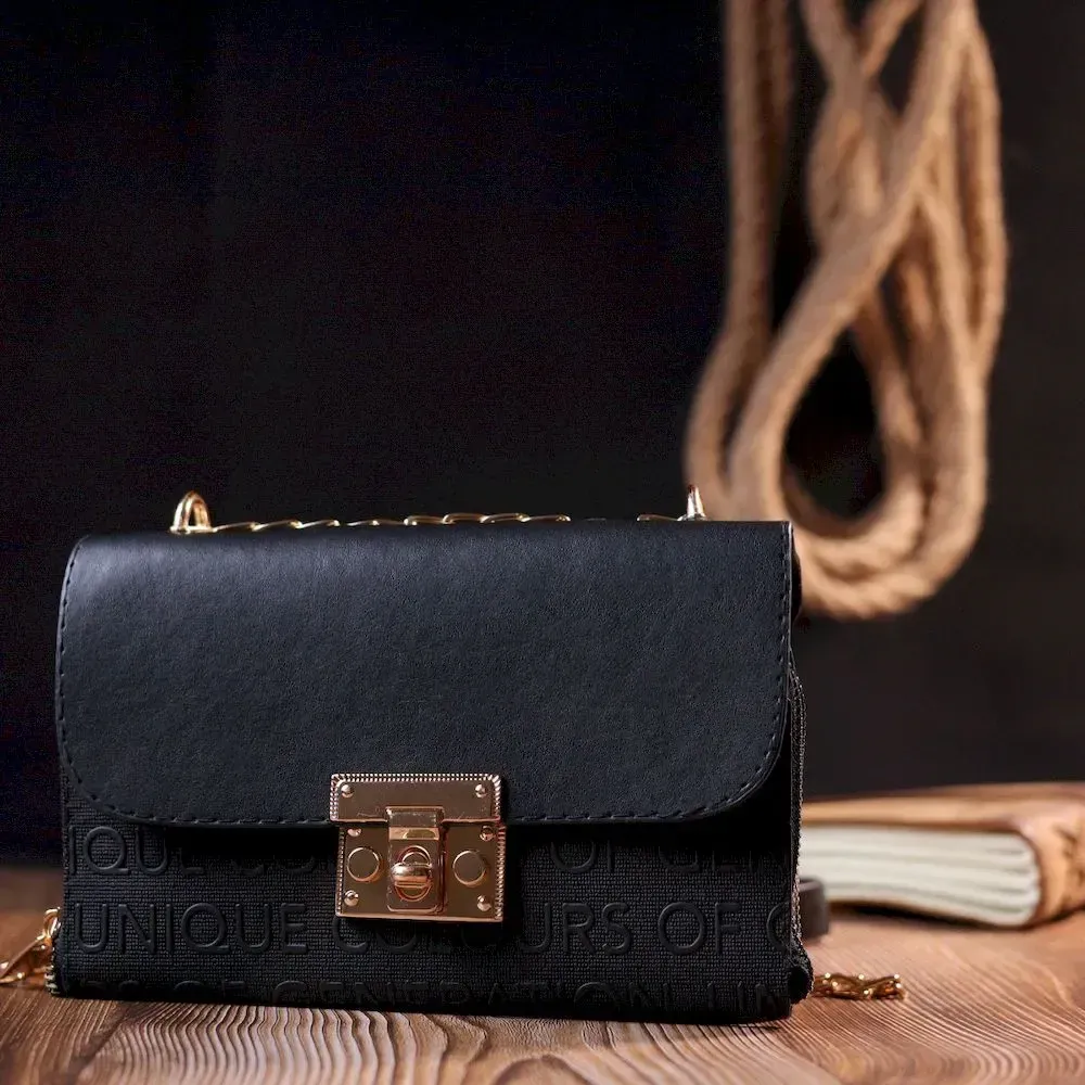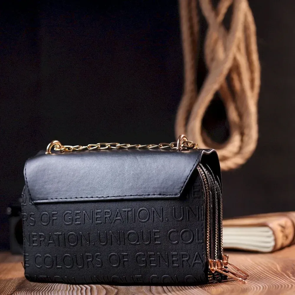 Красива мініатюрна сумка чорного кольору з якісної еко-шкіри з буквеним тисненням. Сумка має стильний дизайн, красиву механічну клямку золотистого кольору, ремінь, що регулюється, з металевого ланцюжка і вставки з еко-шкіри. Модель довгий час залишається у ідеальному стані, таку сумку приємно носити. Може бути чудовим варіантом для подарунка стильній жінці.