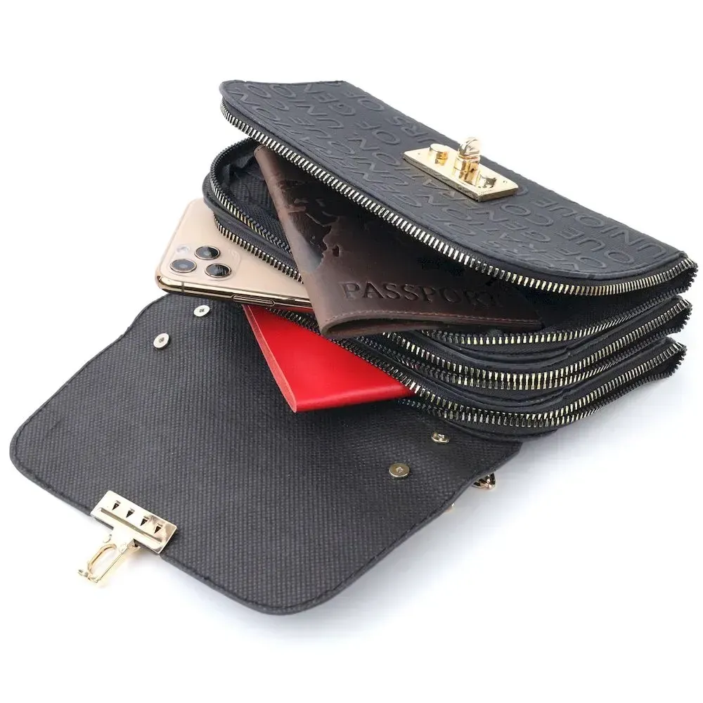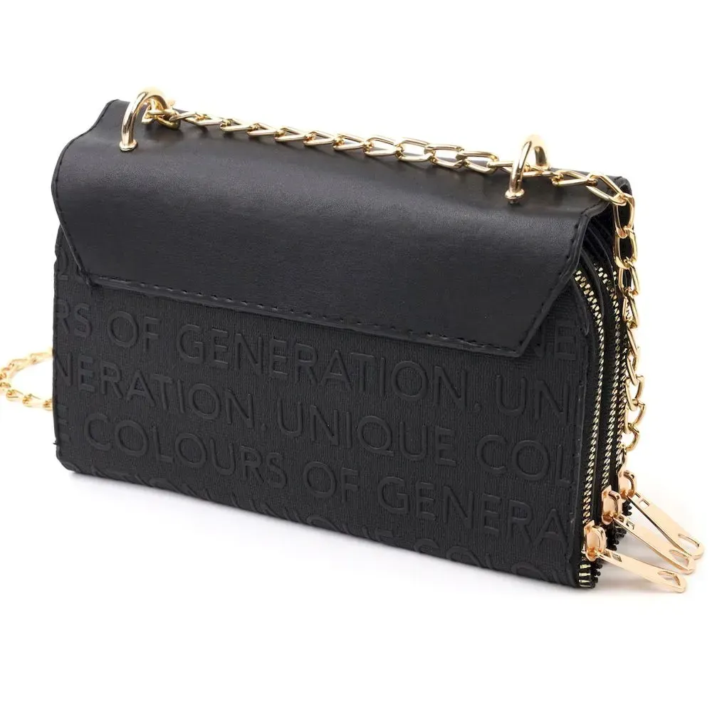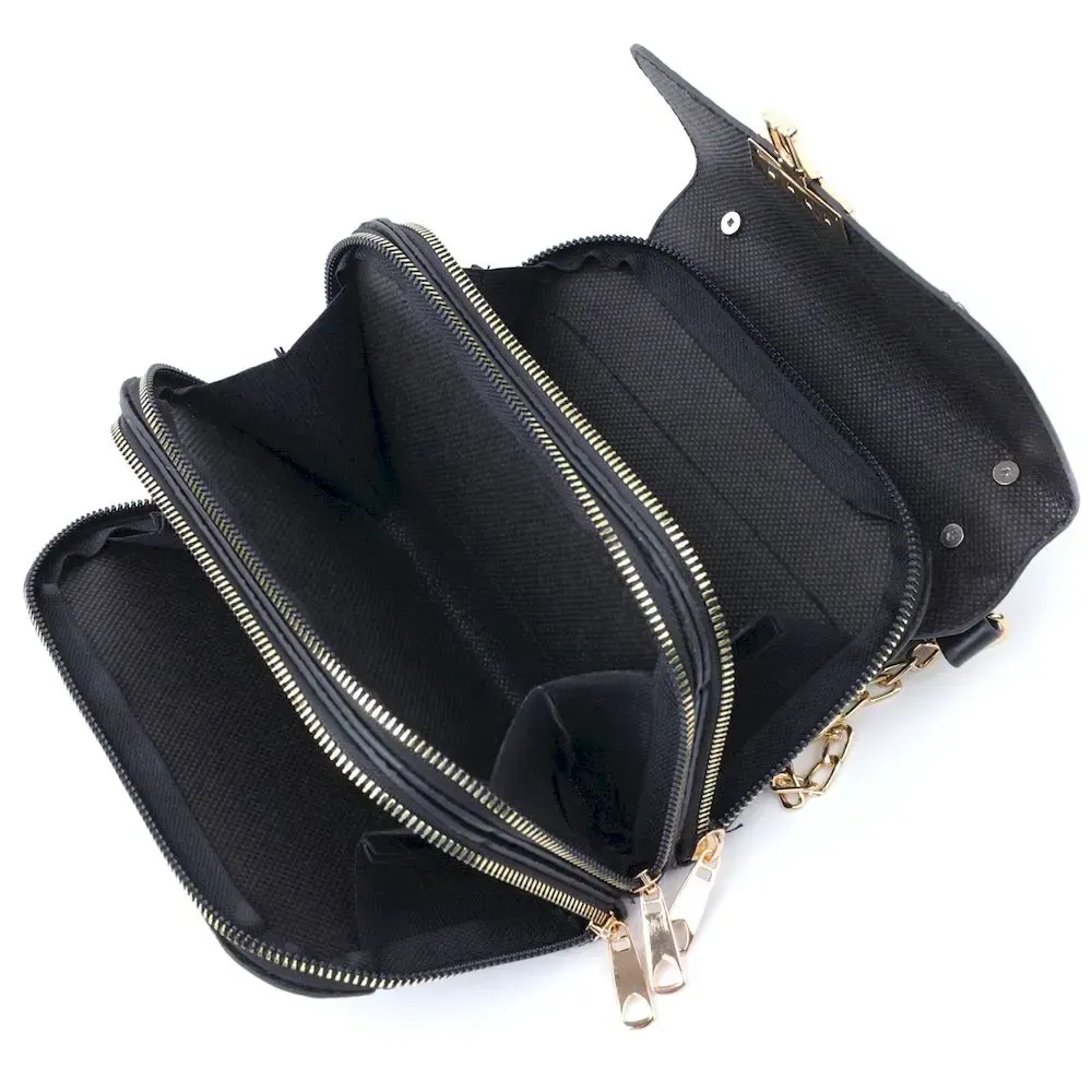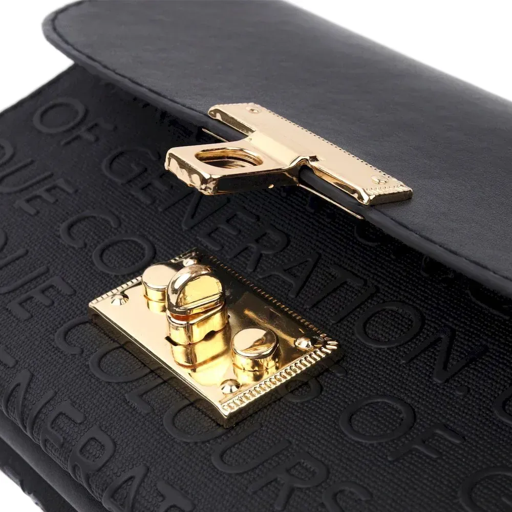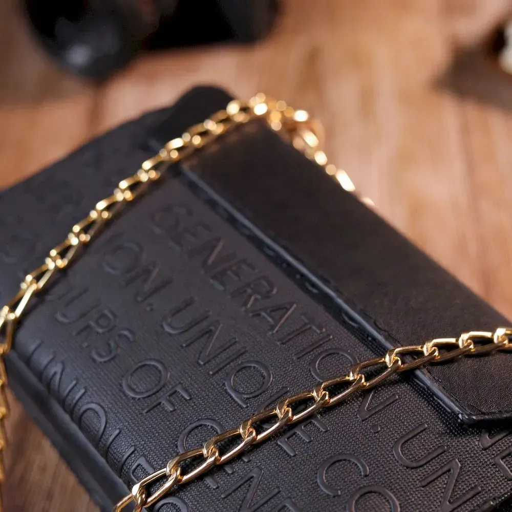 Красива мініатюрна сумка чорного кольору з якісної еко-шкіри з буквеним тисненням. Сумка має стильний дизайн, красиву механічну клямку золотистого кольору, ремінь, що регулюється, з металевого ланцюжка і вставки з еко-шкіри. Модель довгий час залишається у ідеальному стані, таку сумку приємно носити. Може бути чудовим варіантом для подарунка стильній жінці.