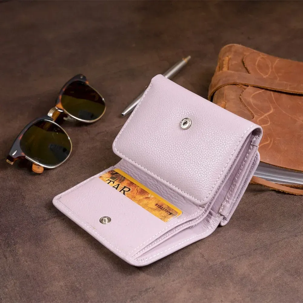 Новинка! Компактний гаманець із натуральної шкіри в фіолетовому кольорі з продуманим дизайном. Аксесуар має зручний функціонал і поміститься навіть у найменшу жіночу сумочку. Виріб складається з двох частин: автономної монетниці на кнопці, яка знаходиться на тильній стороні аксесуара та основної частини для купюр та кредиток. Компактні гаманці вибирають практичні дівчата, які цінують якість та комфорт. Гаманець упакований у фірмову коробку і стане найкращим подарунком для вашої другої половинки.