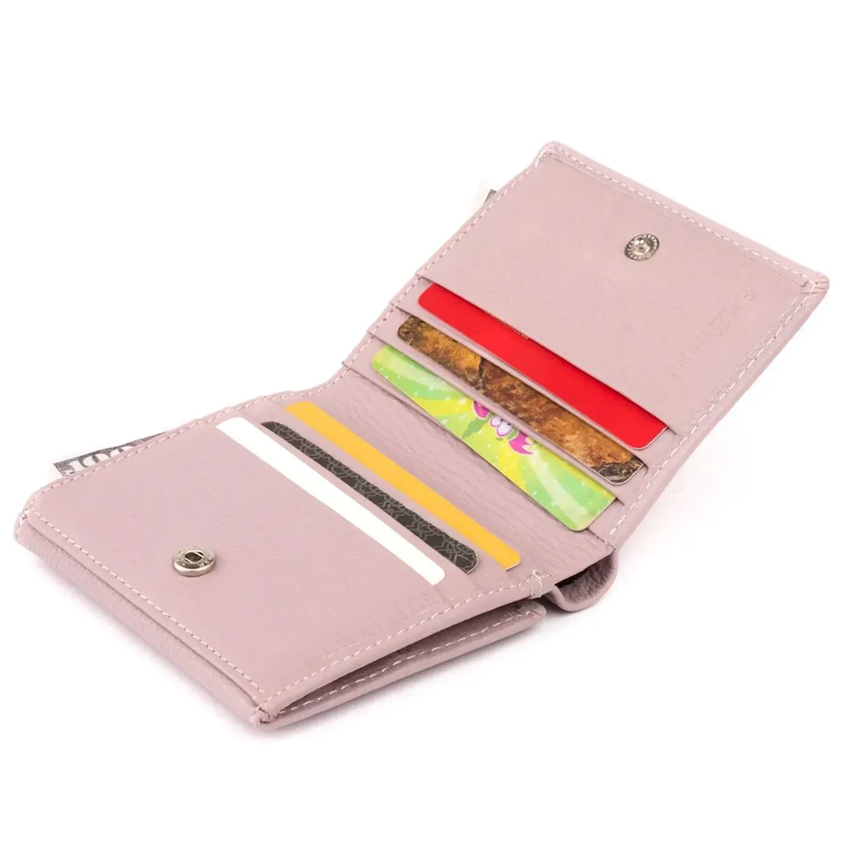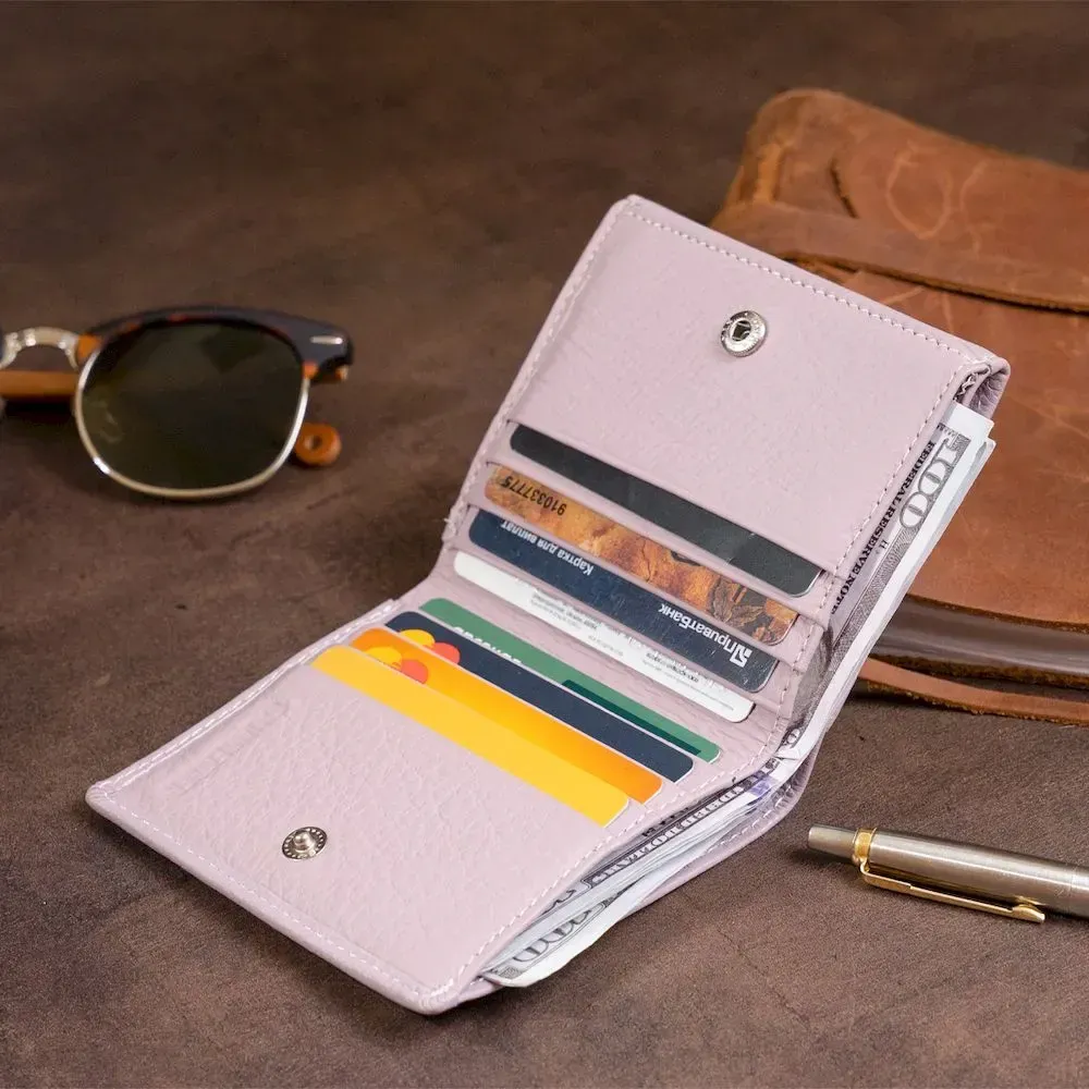 Шкіряний жіночий гаманець компактного розміру та стильного неперевершеного лілового кольору. Ми впевнені, що модель у даному кольорі не залишить байдужою будь-яку дівчину. Гаманець має дві автономні частини: монетницю на кнопці на лицьовій стороні та основну частину гаманця з відділеннями для карток та слотами для кредиток. Розміри гаманця дозволяють йому поміститися навіть у найменшу жіночу сумочку. Аксесуар підійде для шанувальників гаманців невеликих габаритів. М'який та еластичний на дотик аксесуар. Виріб має легкий запах натуральної шкіри. Зручно сидить у руці. Модель упакована у фірмову коробку білого кольору. Таким чином, вам не доведеться морочитися з додатковою упаковкою гаманця, якщо ви вибрали його на подарунок.