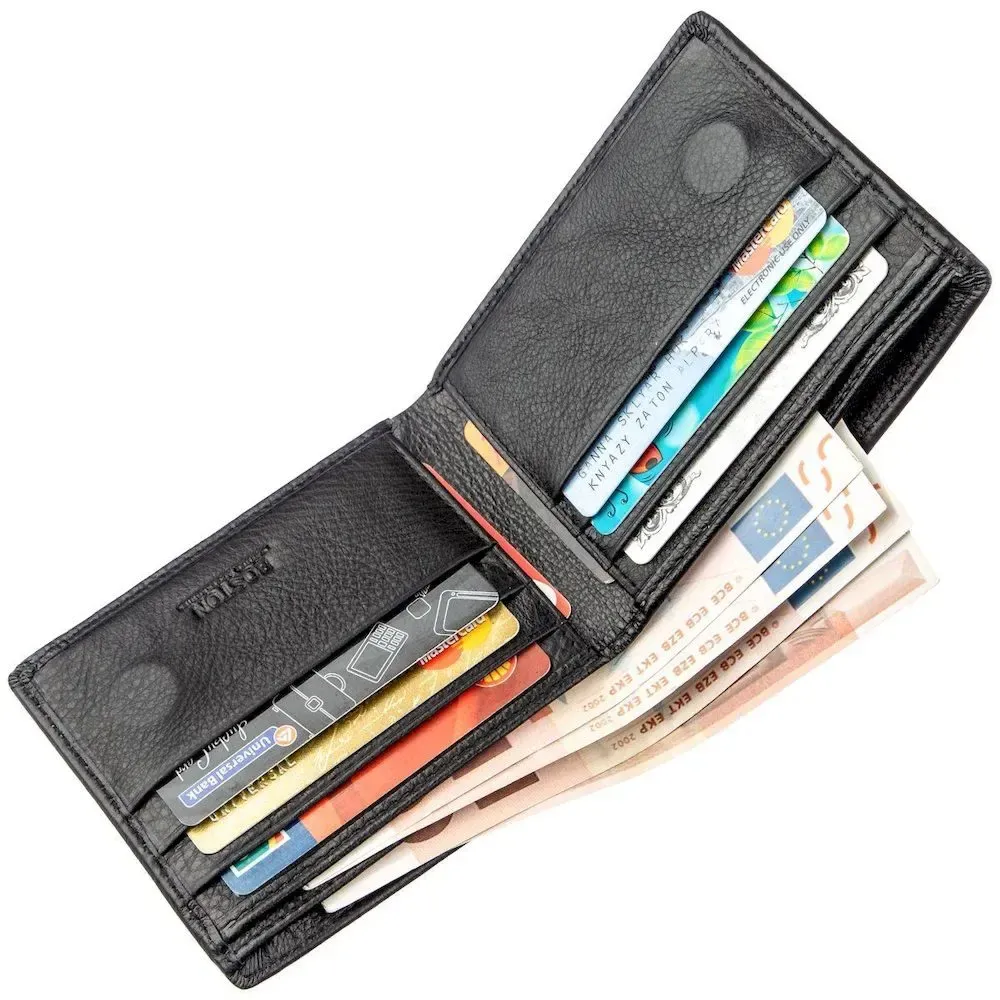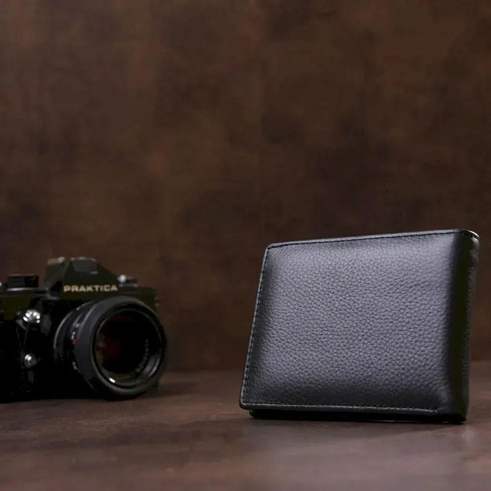 Компактний чоловічий гаманець з натуральної шкіри у витриманому стилі першокласної якості. Має гарний та практичний чорний колір з матовим відтінком. У гаманці є всі необхідні відділення, у тому числі і для пластикових карт, і для купюр, і для сім-карт. Отже, можете бути впевненими, що через його невеликий розмір функціональність гаманця ніяк не постраждала. Закривається аксесуар на магніт, що дуже зручно. Отримавши у подарунок такий гаманець чоловік залишиться дуже задоволеним та вдячним. Запаковано виріб у картонну білу коробку з фірмовим логотипом.