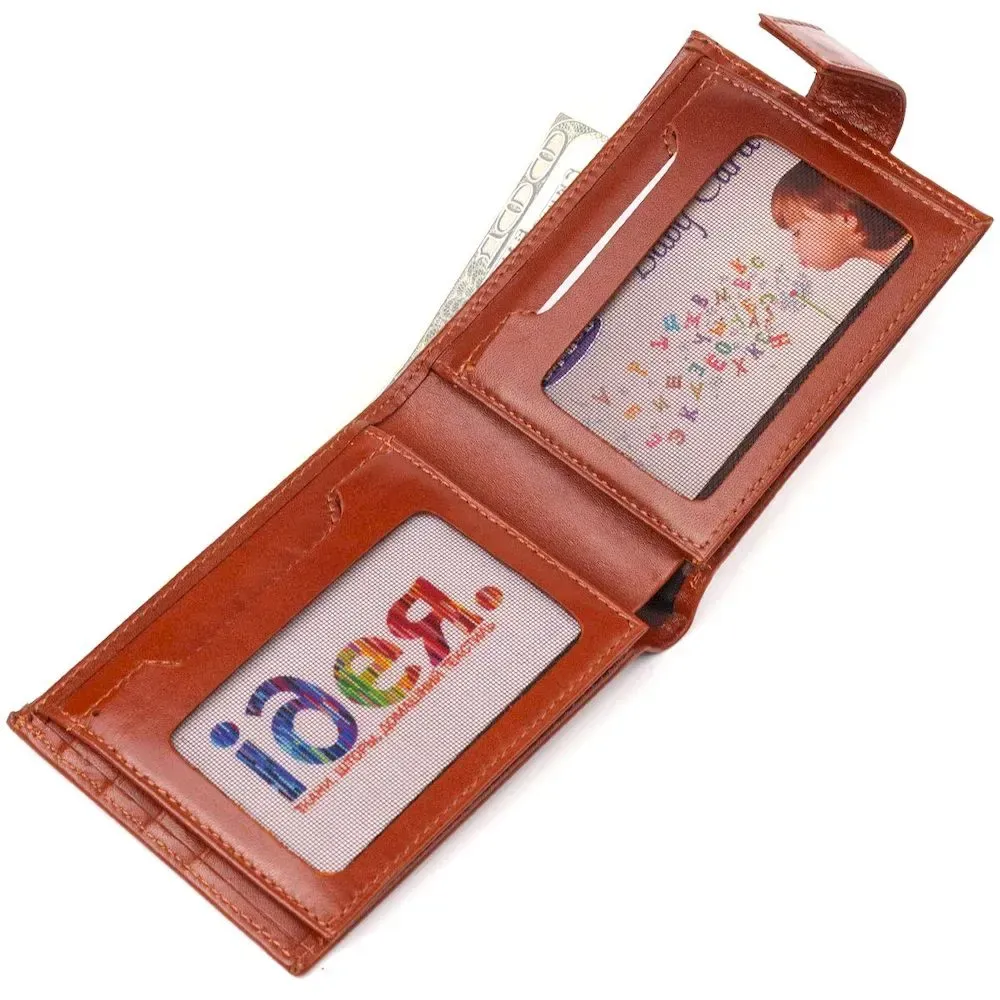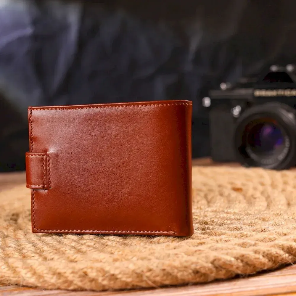 Невелике чоловіче портмоне, з натуральної гладкої шкіри. Аксесуар має одне основне відділення з перегородкою, в якому розміщуються купюри всіх номіналів, дванадцять кишень для карток, чотири з яких під сіточкою. Закривається аксесуар хлястиком на кнопку. Колір фурнітури – срібло. Ви легко зможете помістити його в кишеню штанів чи маленьку сумку. Запакований гаманець картонну коробку. Шкіряний гаманець є чудовим подарунком для рідних та близьких людей.