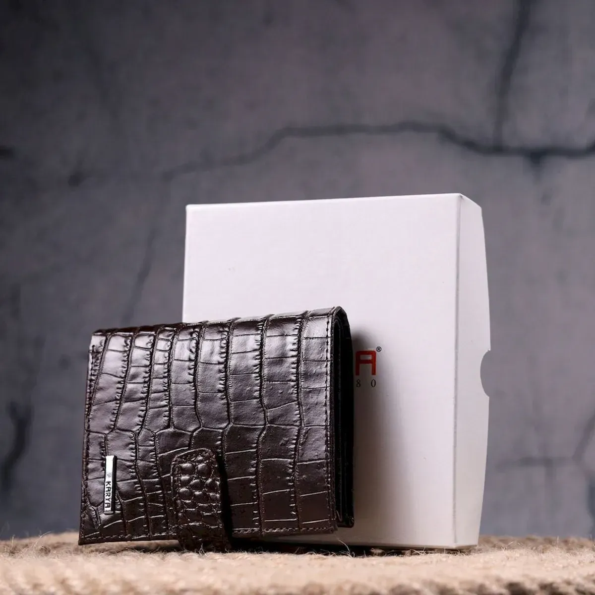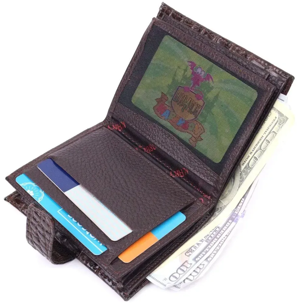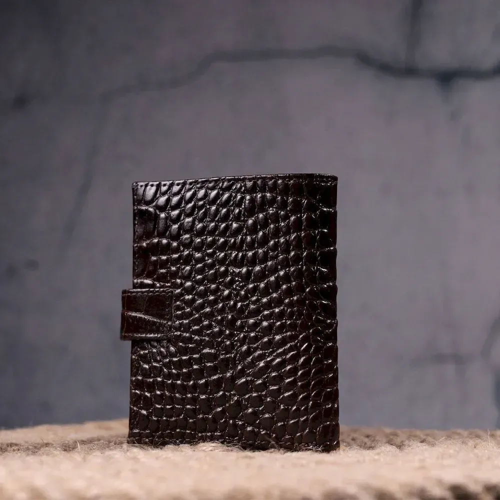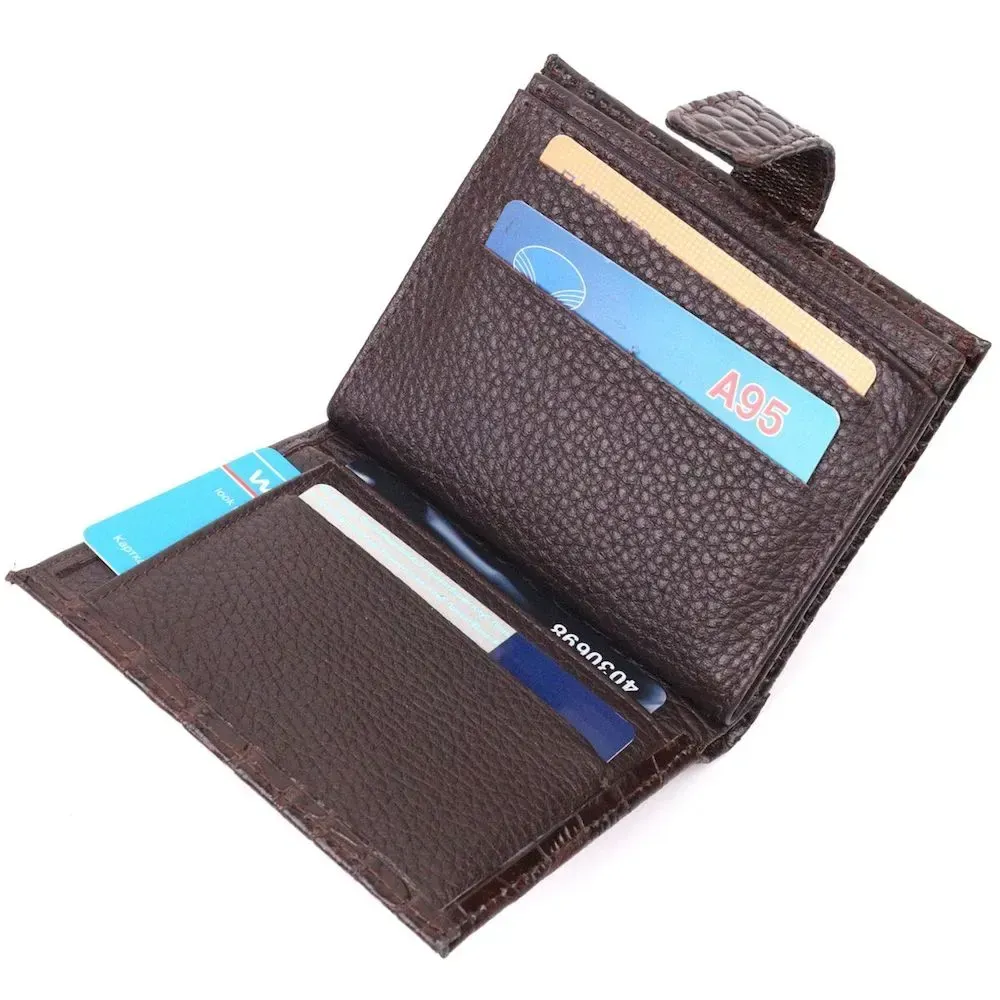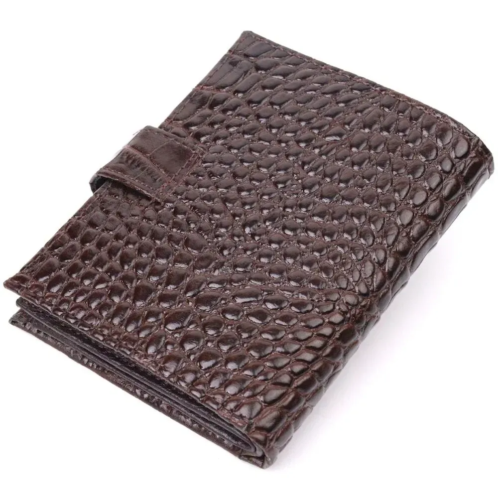 Тонке компактне портмоне з натуральної шкіри з тисненням під крокодила, що закривається хлястиком на кнопку. Виріб має велику кишеню для купюр. Усередині достатньо осередків для кредиток. Виріб продуманий для сучасної людини. Виріб має насичений коричневий колір. Оригінальний аксесуар вигідно виділить вас із натовпу. Гаманець стане чудовим подарунком для Ваших близьких.