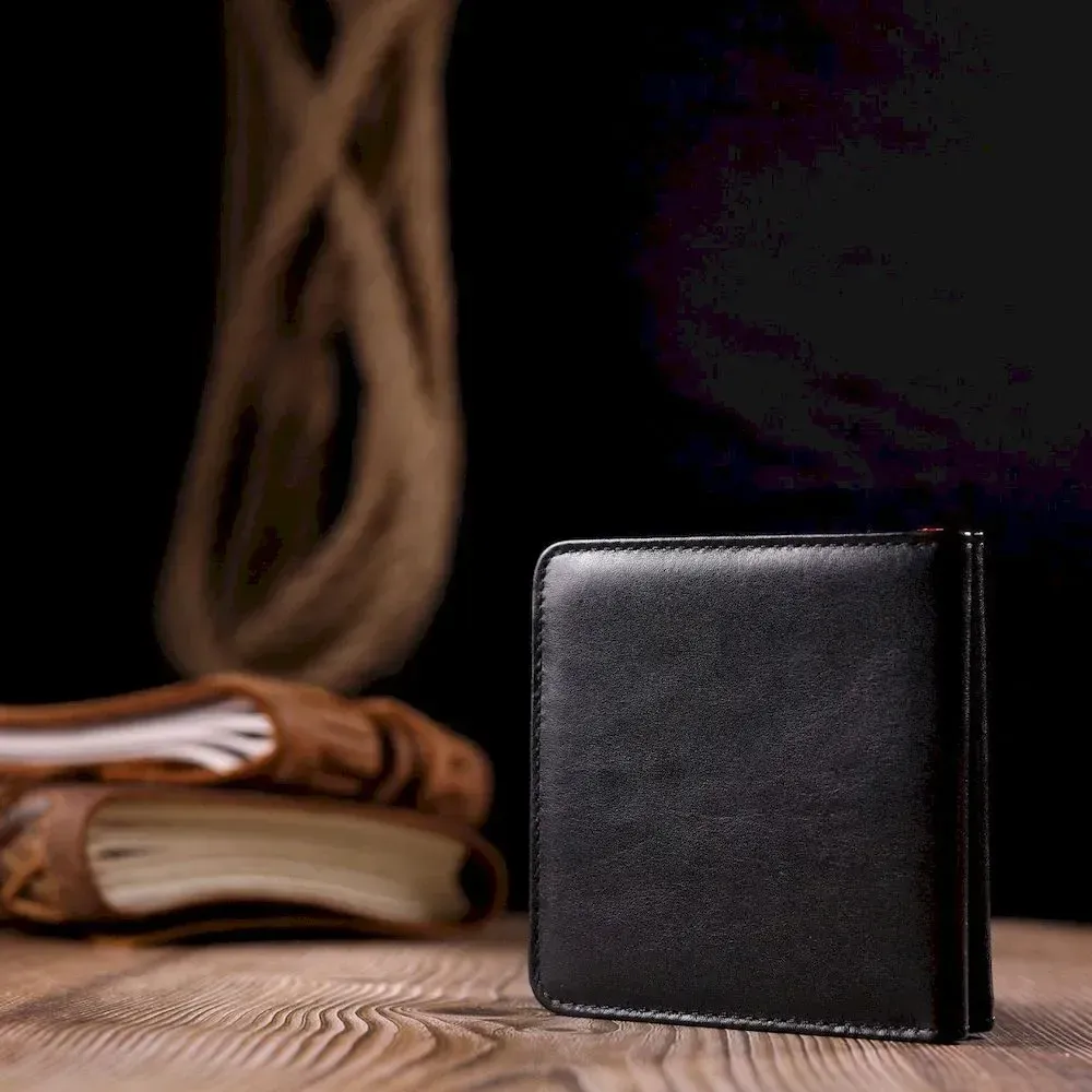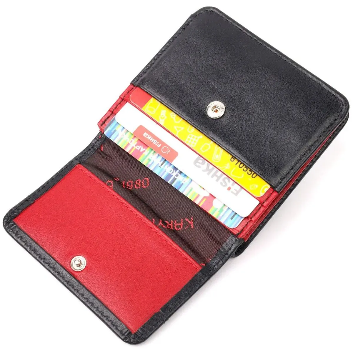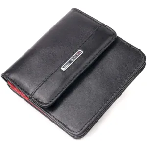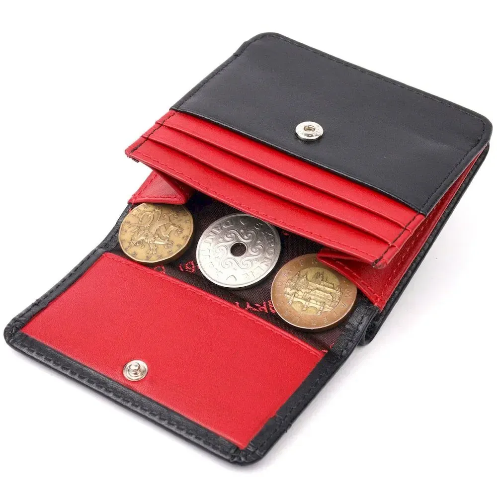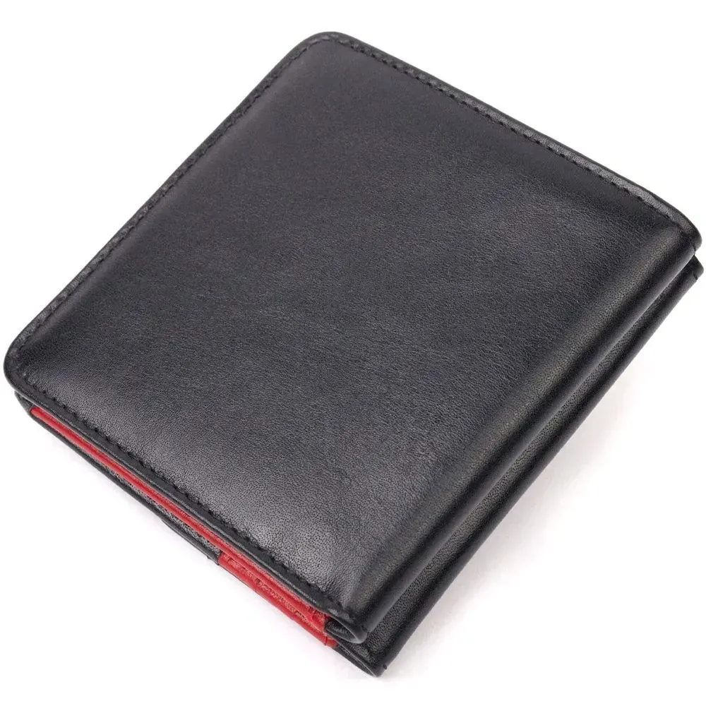 - закривається на кнопку; - виріб упакований у фірмову коробку. Компактний жіночий гаманець з натуральної шкіри, двоколірний - зовні чорний, а всередині червоний. Складається аксесуар навпіл, закривається на кнопку. Якісна фурнітура доповнює та прикрашає виріб. Такий гаманець з натуральної шкіри - це ідеальний варіант на кожен день для тих, хто цінує якість, зручність та комфорт, а також чудово доповнюватиме Ваш повсякденний образ. Запакований аксесуар у фірмову коробку та пакет бренду. Вироби з натуральної шкіри завжди будуть чудовим подарунком для близької людини.