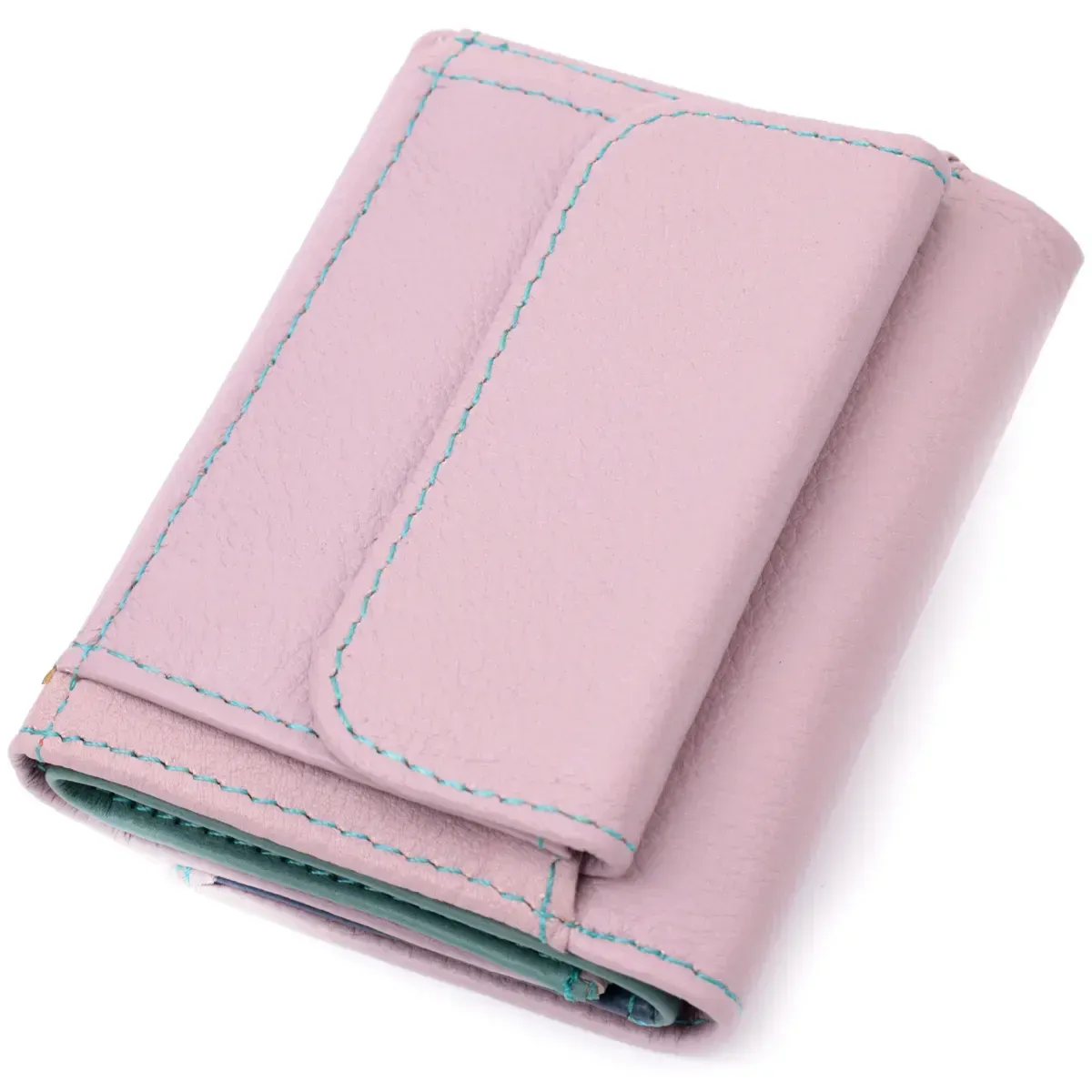 Ніжне жіноче портмоне в три складення з натуральної шкіри найвищої якості. Акцентом цього гаманця є колір, точніше кілька кольорів – він бежево-рожевого кольору зовні та багатобарвний усередині. Аксесуар складається з двох містких відділень для купюр, двох осередків для карток та кишені для монет. Зовні виріб прошитий рівним рядком бірюзового кольору по краю і прикрашений металевим логотипом компанії виробника. Портмоне доповнено надійною фурнітурою та міцною підкладкою. Укомплектований гаманець у фірмову картонну коробку білого кольору.