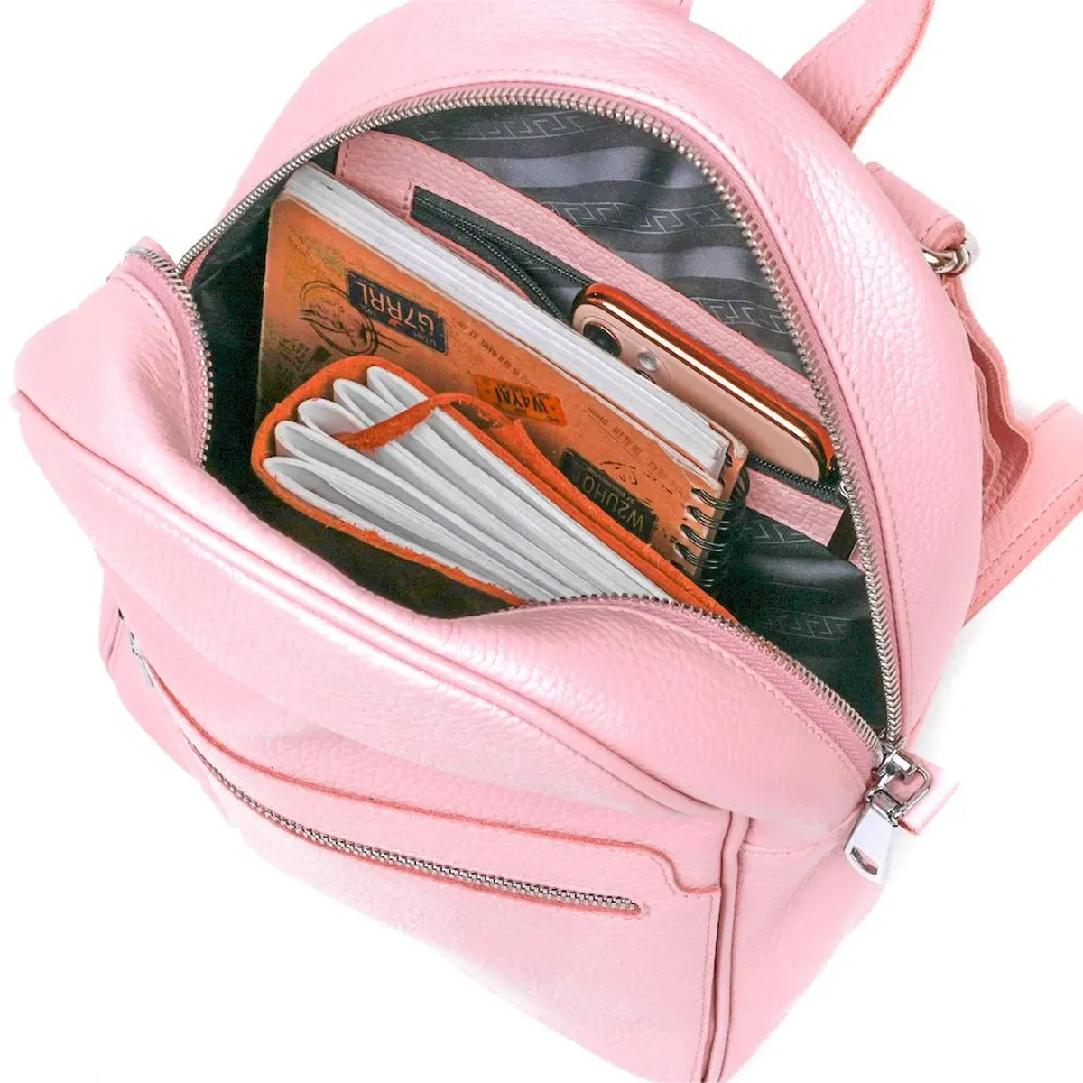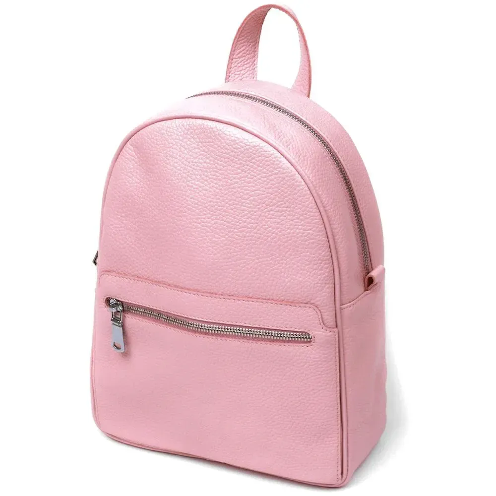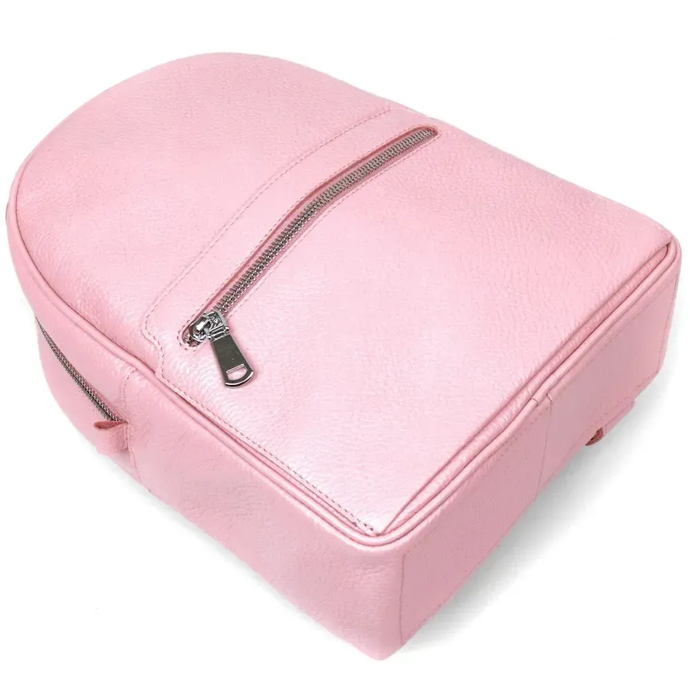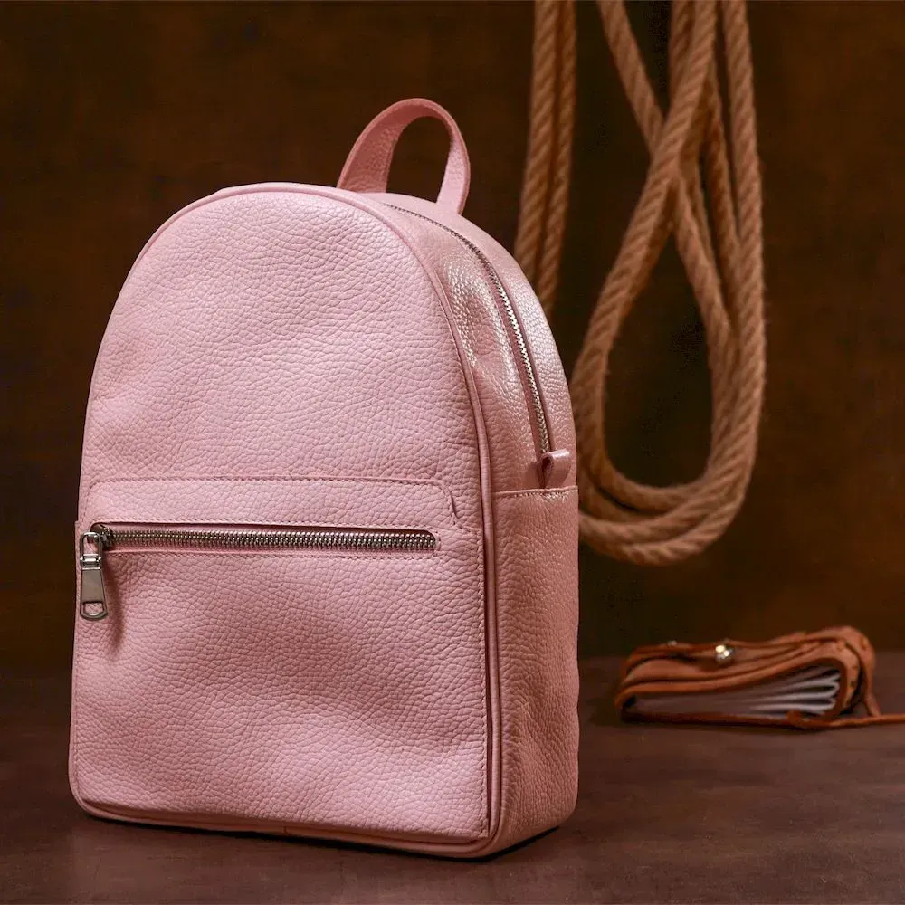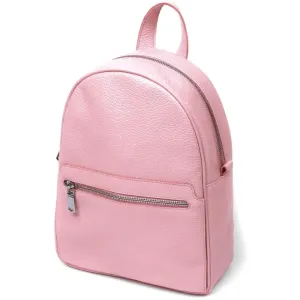 Невеликий жіночий рюкзак у міському стилі для цінителів компактних, але містких аксесуарів. Матеріал виготовлення – натуральна шкіра високої якості та підвищеної міцності. Колір даної моделі ніжно-рожевий, фактура – зерниста і приємна на дотик. Усередині є одне відділення та дві кишені, на зовнішній стороні – кишеню на блискавці. Такий рюкзак стане чудовим подарунком коханій людині.