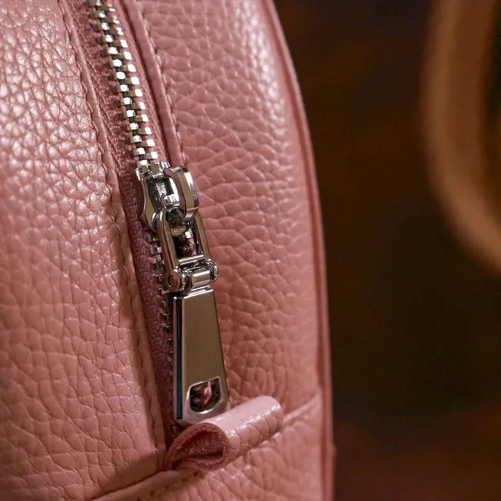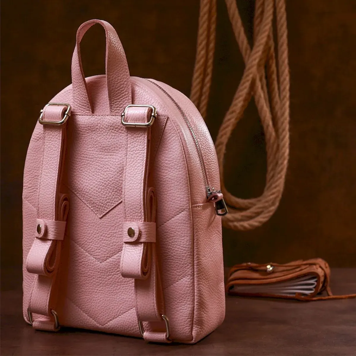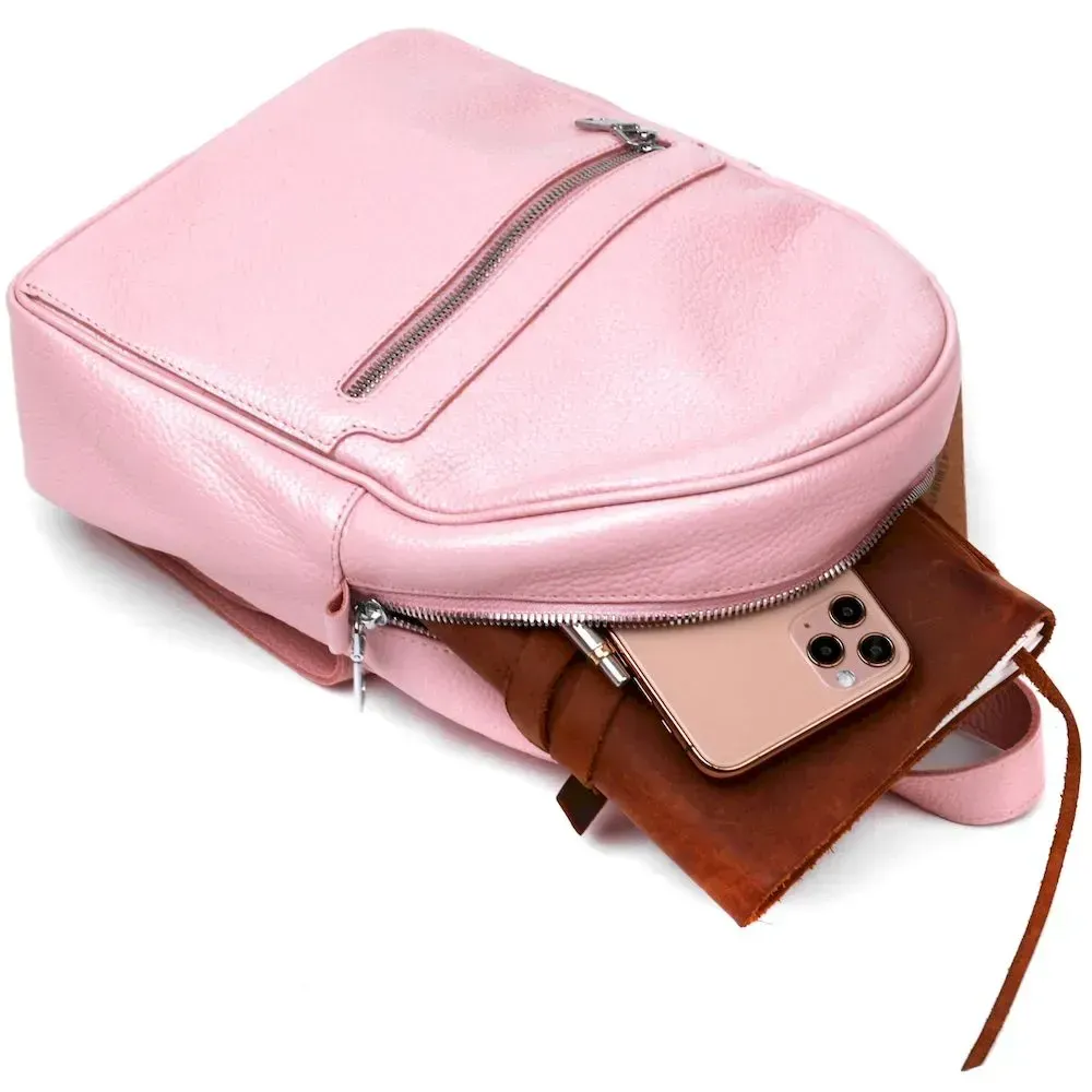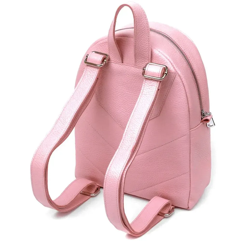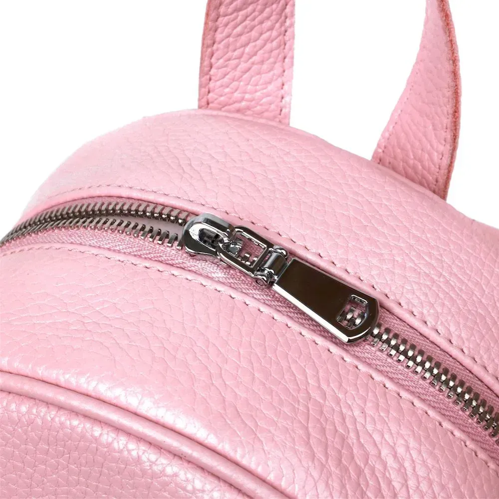 Невеликий жіночий рюкзак у міському стилі для цінителів компактних, але містких аксесуарів. Матеріал виготовлення – натуральна шкіра високої якості та підвищеної міцності. Колір даної моделі ніжно-рожевий, фактура – зерниста і приємна на дотик. Усередині є одне відділення та дві кишені, на зовнішній стороні – кишеню на блискавці. Такий рюкзак стане чудовим подарунком коханій людині.