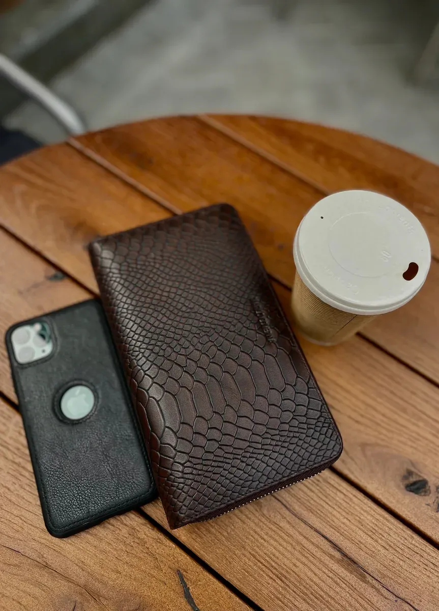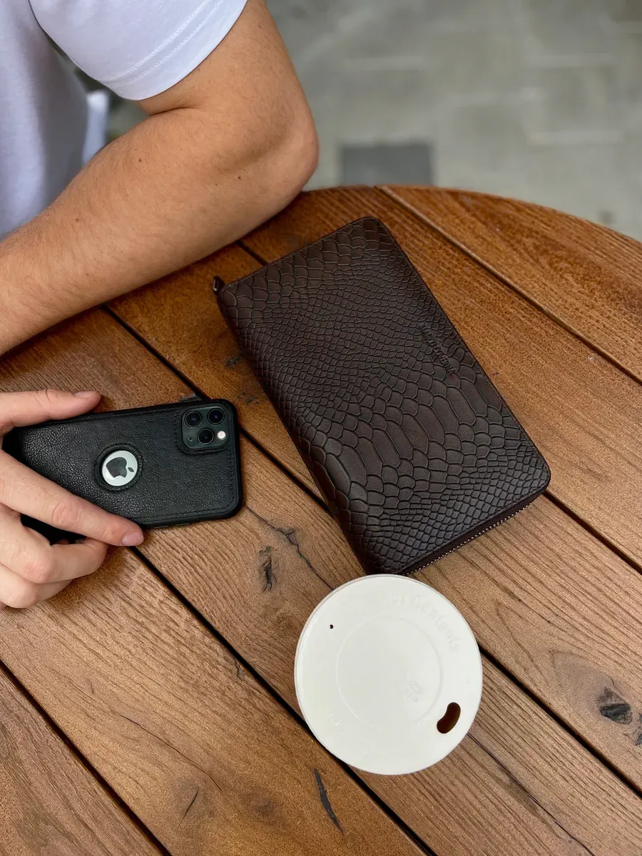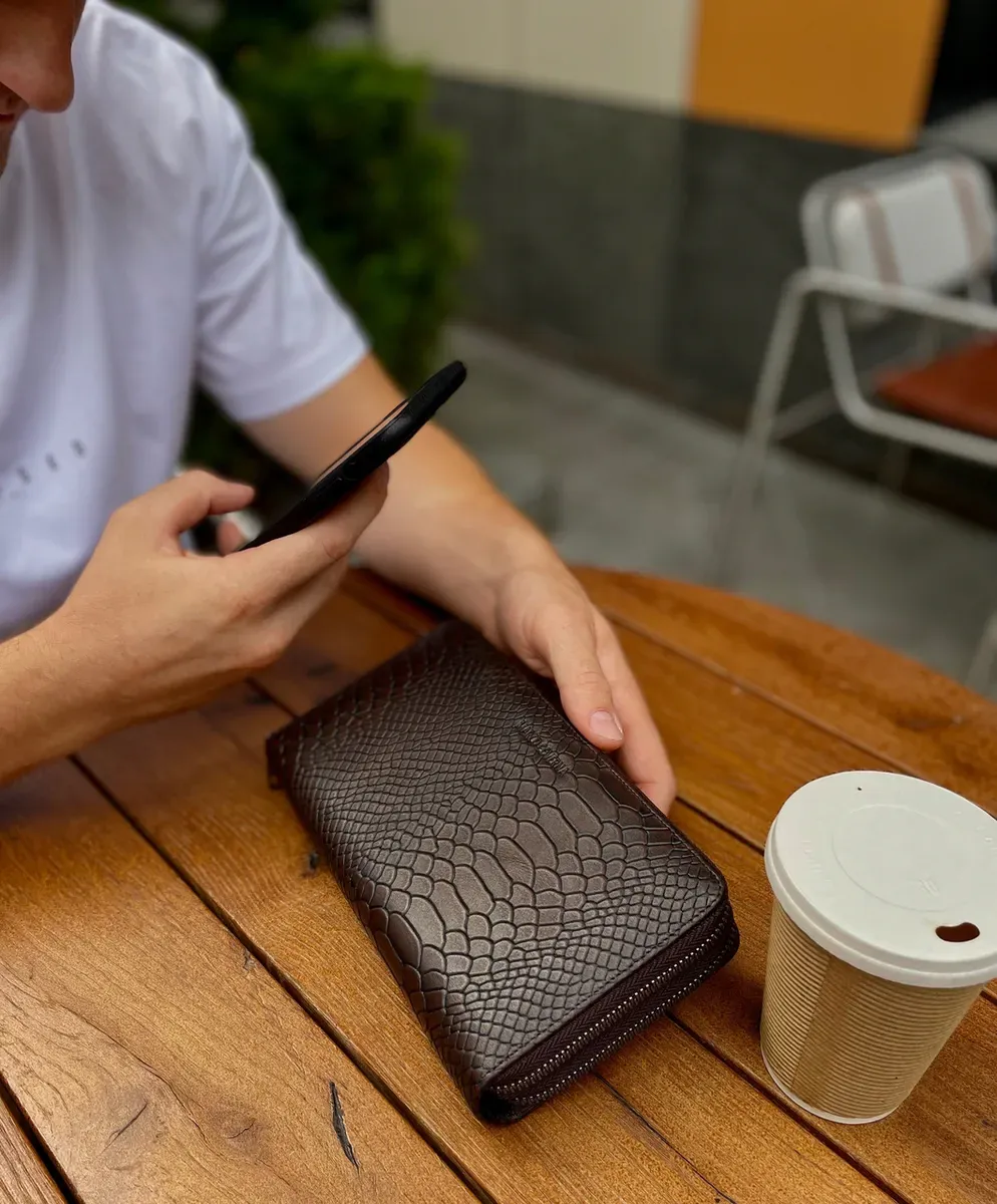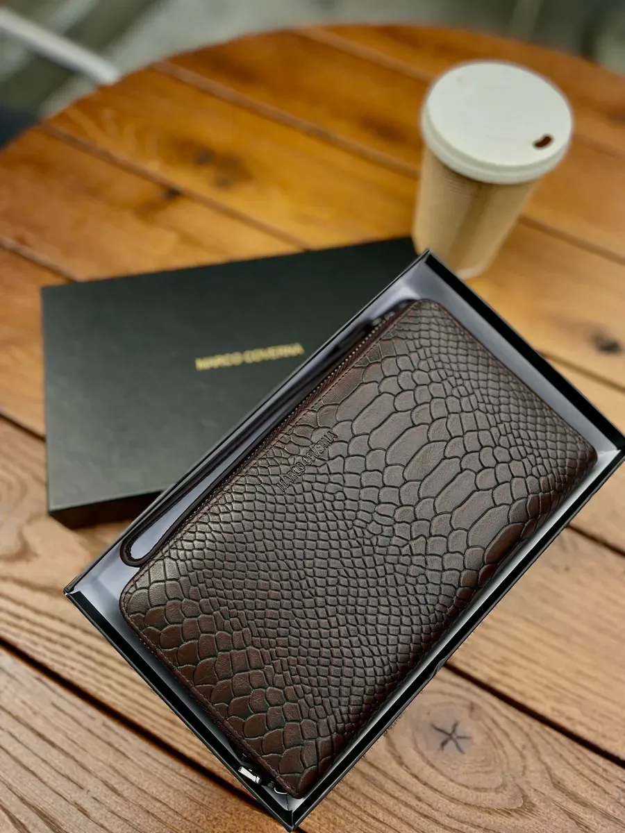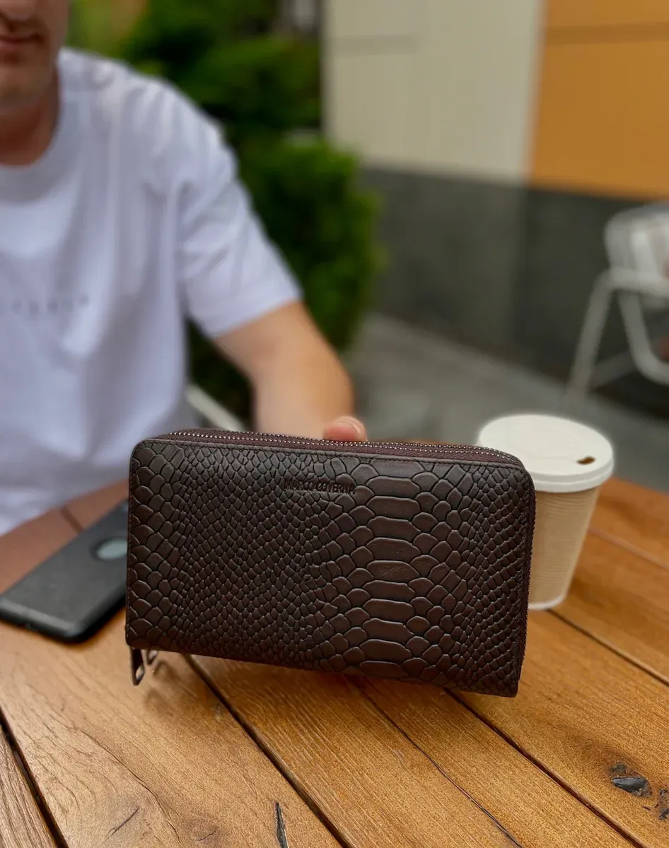 Чоловічий гаманець за типом клатча не тільки стильний, але й практичний. У ньому є все необхідне: відділення для купюр, кишеня-перегородка на блискавці для монет і блок під кредитки. Дві прилеглі до стінки кишеньки підходять для банкнот або паперів. Відкритий доступ до 24 банківських карток. До того ж у ньому є петля для носіння ручки. На особливу увагу заслуговує стиль шкіряного чоловічого гаманця. Зміїна шкіра вдало поєднується з металевою блискавкою. Аксесуар можна носити у формі клатча. Для цього передбачені два ремені: на зап'ястку та долоню.