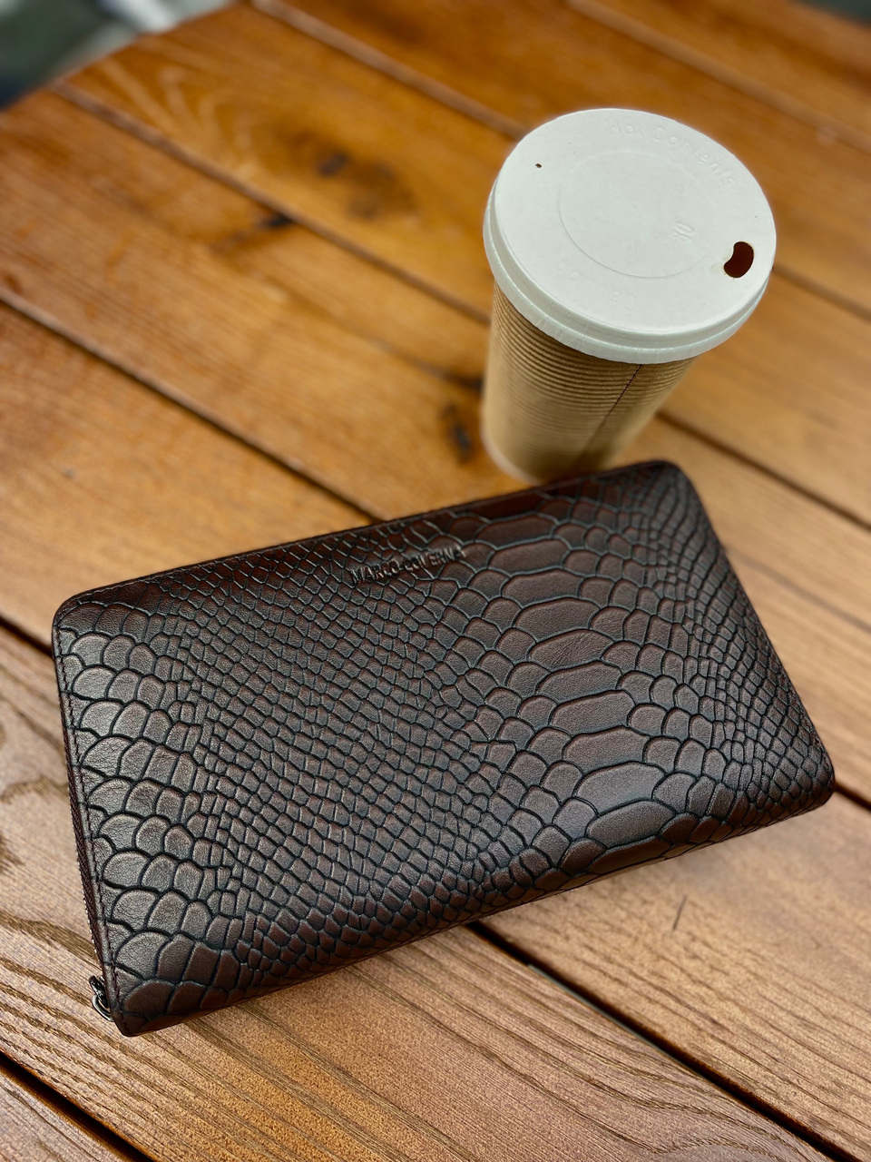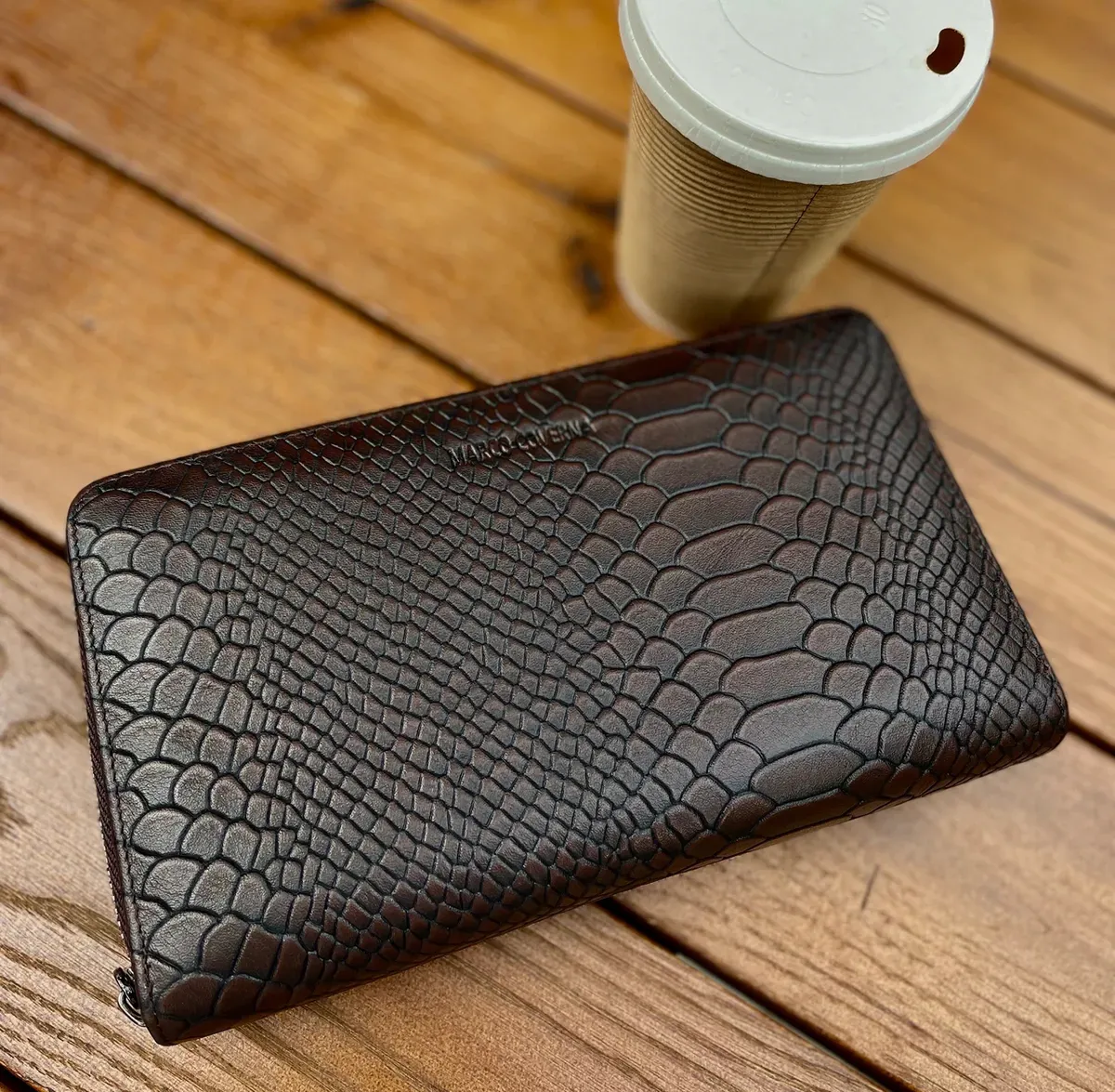 Коричневий гаманець-клатч Marco Coverna MC086-5901C виконаний з фактурної натуральної шкіри. Модель обладнана двома відділеннями на блискавках і зручним блоком для карток.