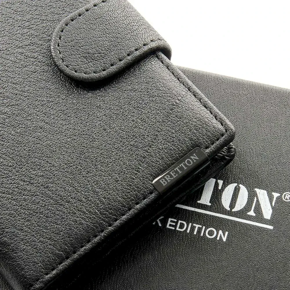 Чоловічий шкіряний гаманець для банкнот Bretton, серія Black Edition. Виготовлений із м'якої натуральної шкіри. Усередині є 6 кишень для візитних карток та 2 кишені-сітки. Зовні знаходиться монетниця на блискавці. Розмір (см.) 11*8,5*2