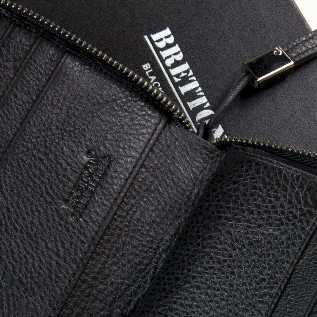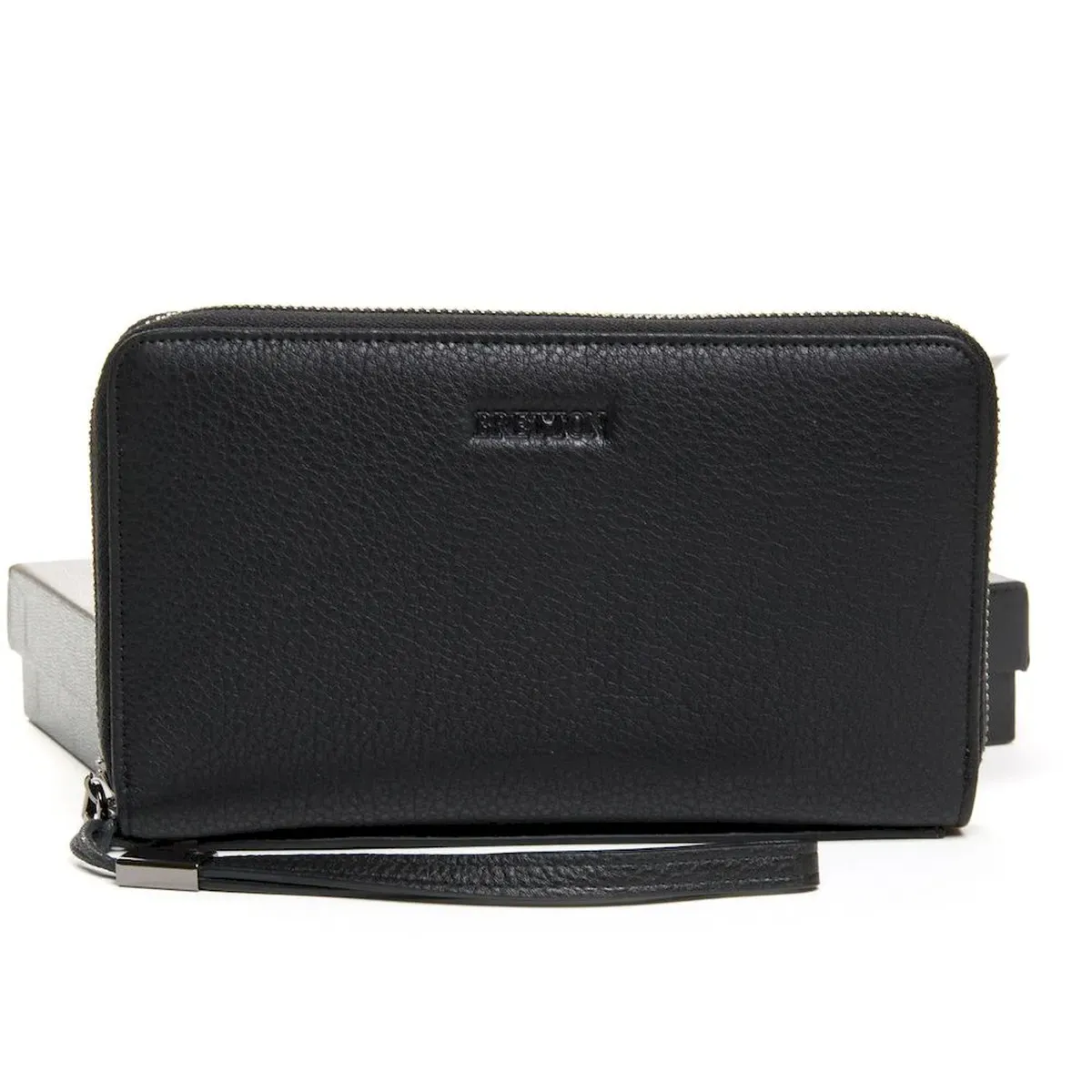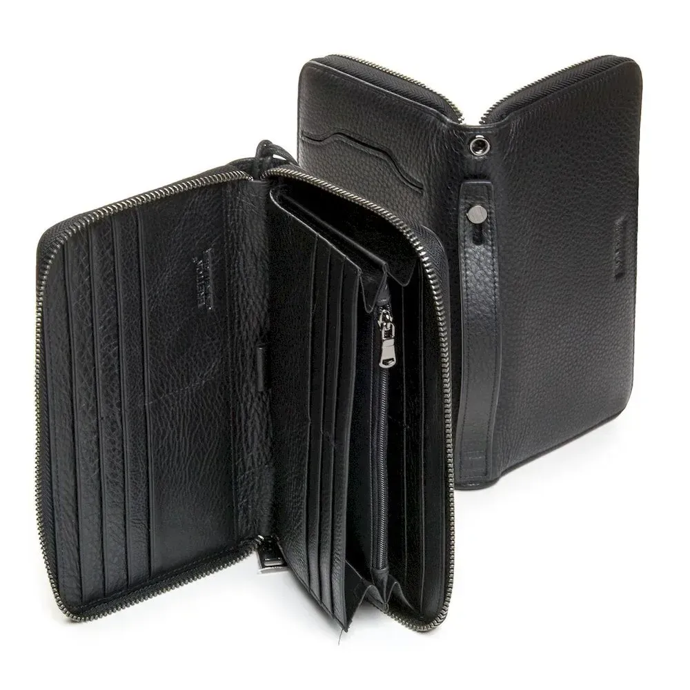 Чоловічий великий шкіряний гаманець-клатч Bretton, серія Black Edition. Виготовлений із м'якої натуральної шкіри. Закривається на блискавці. Усередині знаходиться 2 окремі кишені для банкнот або сматрфона, велика кишеня-монетниця на блискавці, 18 кишень для візитних карток і 2 великі відкриті кишені.