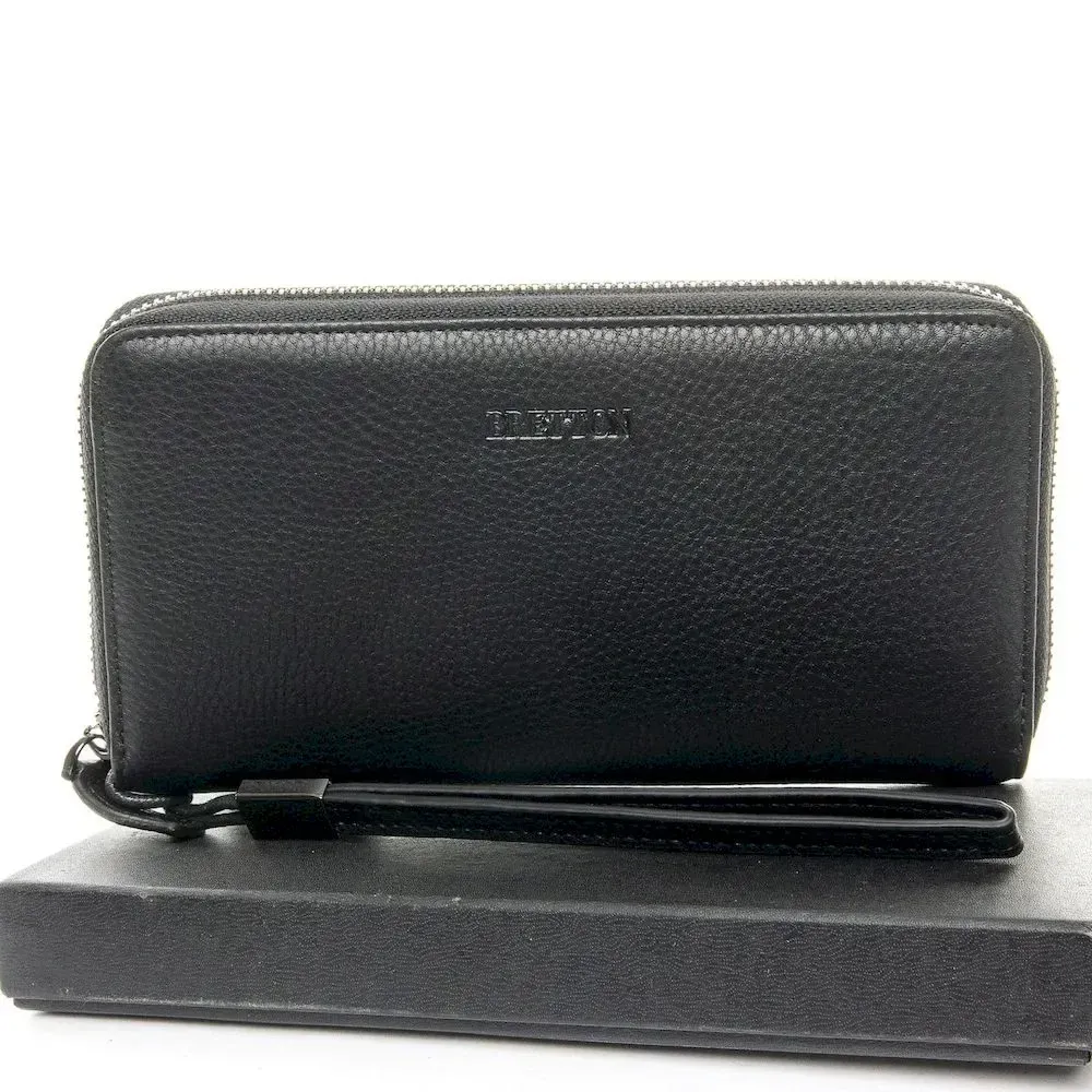 Чоловічий великий шкіряний гаманець-барсетка Bretton, серія Black Edition. Виготовлений із м'якої натуральної шкіри. Закривається на блискавку. Усередині є 3 окремі кишені для банкнот або сматрфона, велика кишеня-монетниця на блискавці, 8 кишень для візитних карток та 2 великі відкриті кишені. У комплекті є знімний кистьовий ремінь.