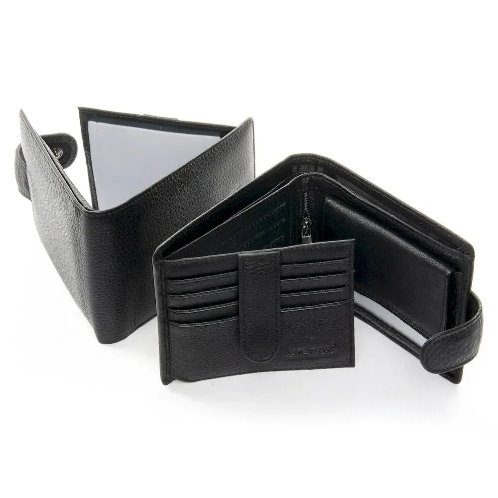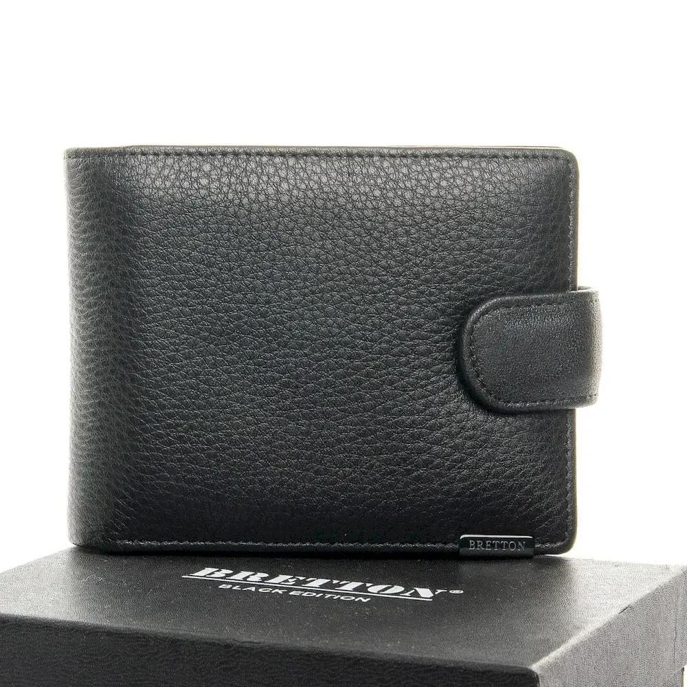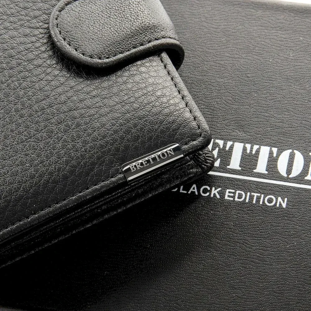 Чоловічий шкіряний гаманець Bretton, серія Black Edition. Виготовлений з м'якої натуральної шкіри. Усередині є два відкриті відділення для банкнот, 9 кишень для візитних карток, 2 великі відкриті кишені, кишеня на блискавці та одна прозора кишеня, монетниця на кнопку. Розмір (див.) 12,5*9,5*3