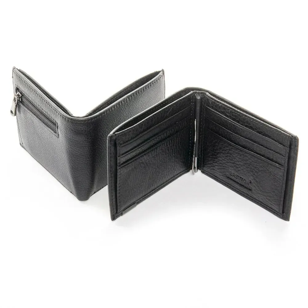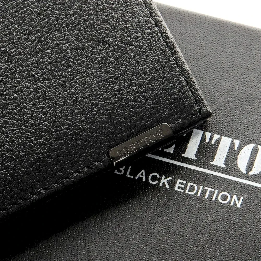 Чоловічий шкіряний гаманець для банкнот Bretton, серія Black Edition. Виготовлений з м'якої натуральної шкіри. Усередині є одне відкрите та одне на блискавці відділення для банкнот, 6 кишень для візитних карток і дві відкриті кишені. Зовні знаходиться монетниця на блискавці. Розмір (див.) 11,5*8*2,5