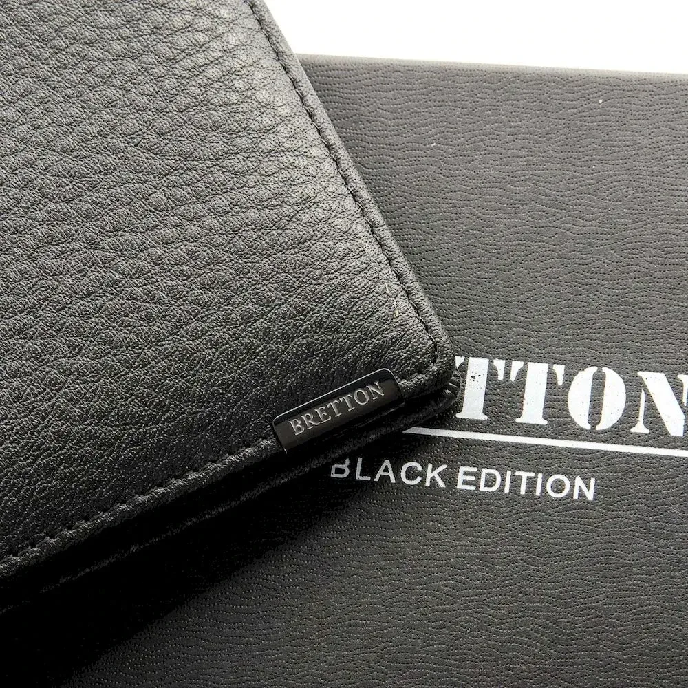 Чоловічий шкіряний гаманець Bretton, серія Black Edition. Виготовлений з м'якої натуральної шкіри. Усередині є дві відкриті та одне на блискавці відділення для банкнот, 3 кишені для візитних карток, 2 великі кишені та монетниця на блискавці. Розмір (див.) 11,5*9,5*2,5