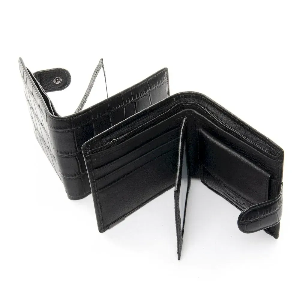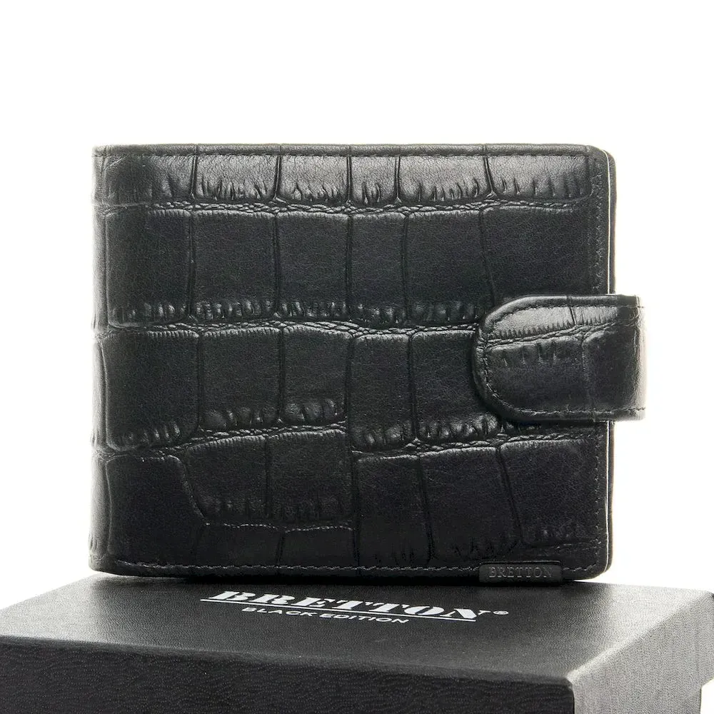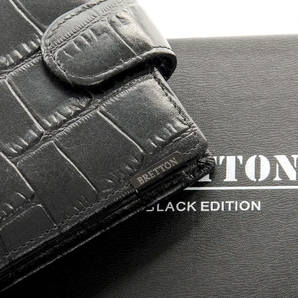 Чоловічий шкіряний гаманець Bretton, серія Black Edition. Виготовлений з твердої натуральної шкіри з текстурою "крокодил". Усередині є дві відкриті та одне на блискавці відділення для банкнот, 3 кишені для візитних карток, 2 прозорі кишені та монетниця на кнопці. Розмір (див.) 11,5*9,5*2,5