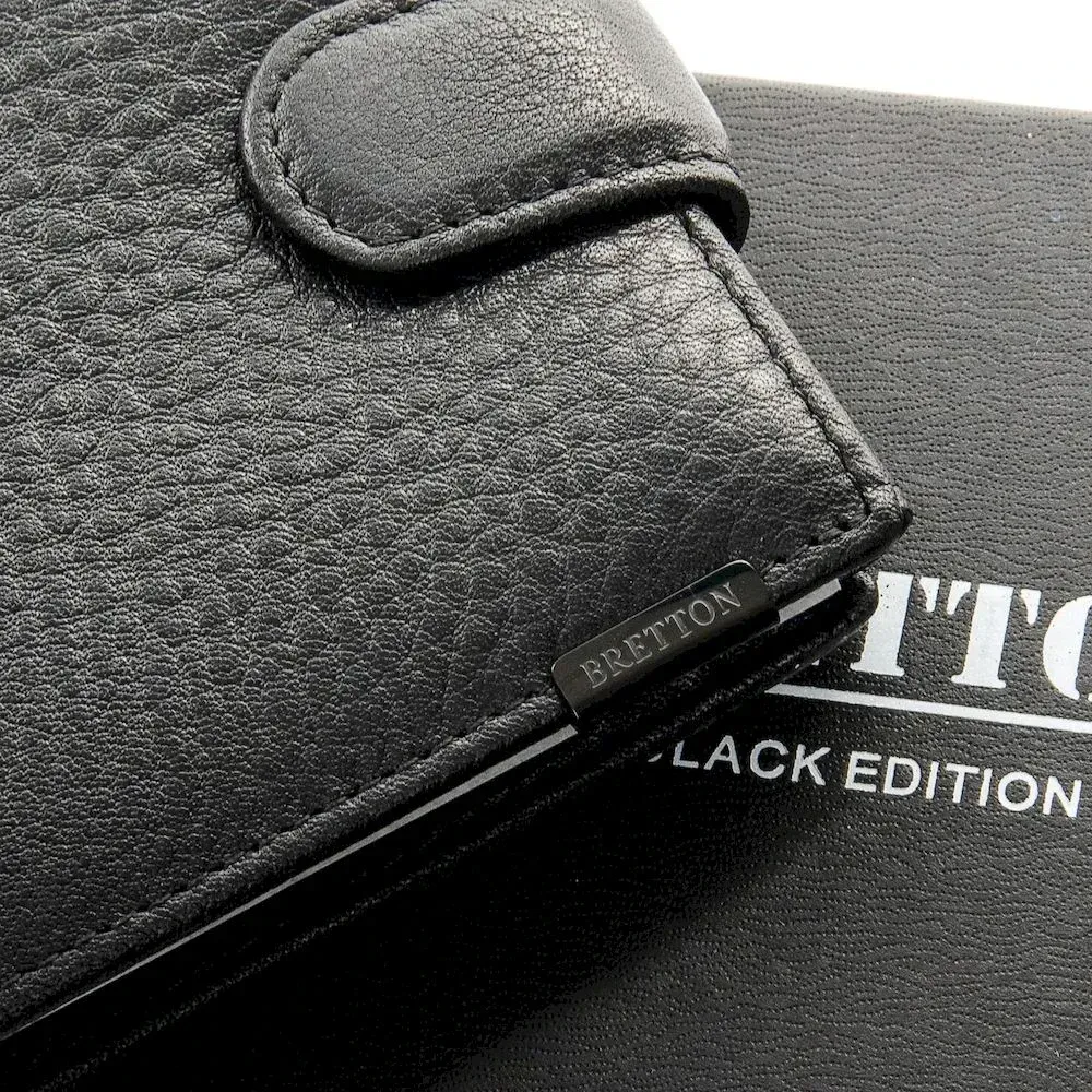 Чоловічий шкіряний гаманець Bretton, серія Black Edition. Виготовлений з м'якої натуральної шкіри. Усередині є дві відкриті та одне на блискавці відділення для банкнот, 3 кишені для візитних карток, 4 прозорі кишені в окремому блоці та монетниця на кнопці. Розмір (див.) 12*9,5*2,5