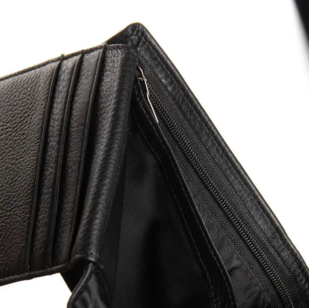 Изготовлен из мягкой натуральной кожи. Внутри есть: два открытых и одно на молнии отделения для банкнот, 6 карманов для визитных карт и 3 открытых кармана и монетница на молнии. Снаружи кошелька расположен карман на молнии
