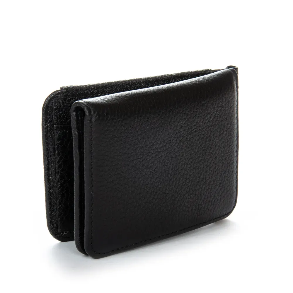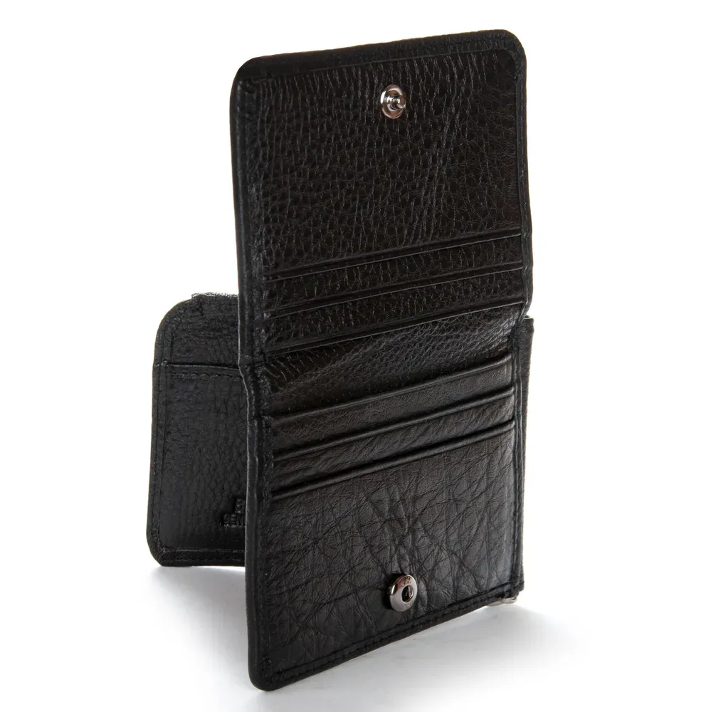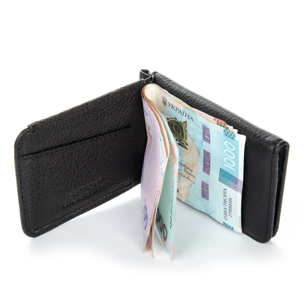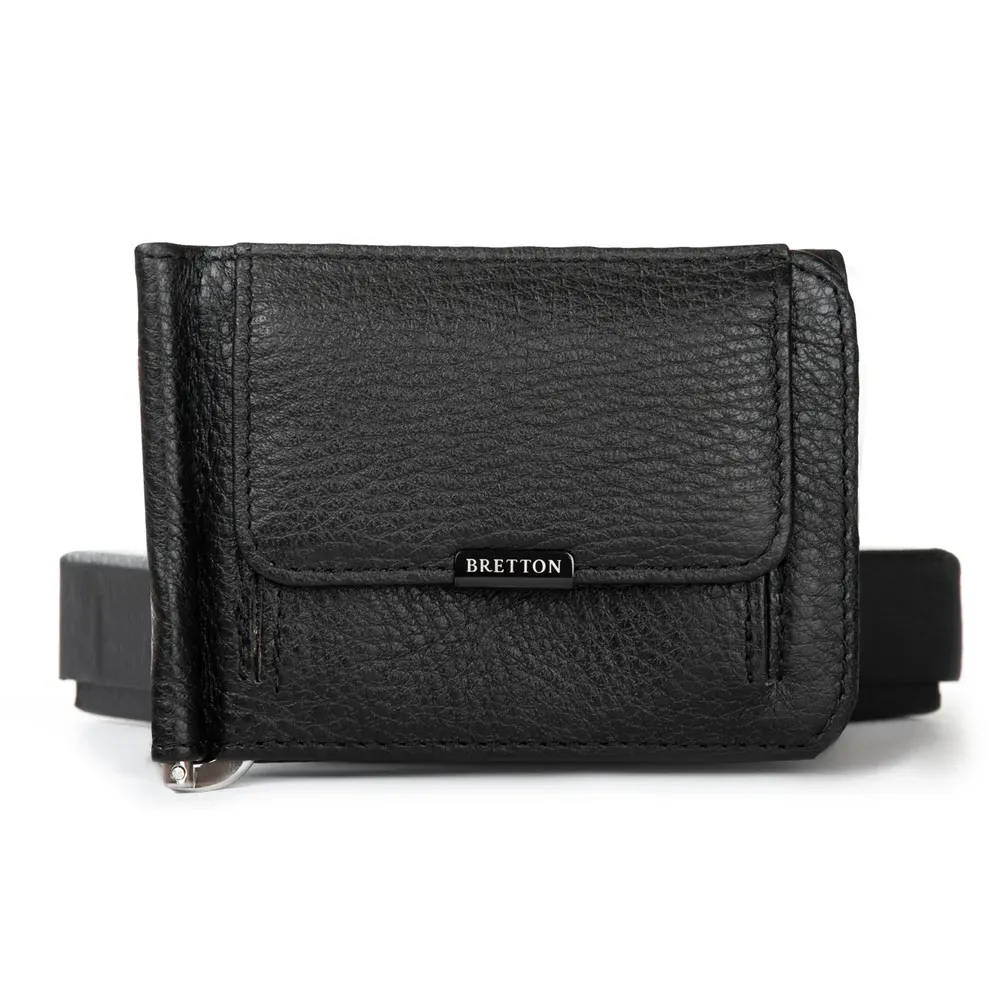 Мужской кожаный кошелек-зажим для банкнот Bretton, серия Black Edition. Изготовлен из мягкой натуральной кожи. Внутри в отдельном блоке есть 6 карманов для визитных карт. Снаружи находится монетница на кнопке.