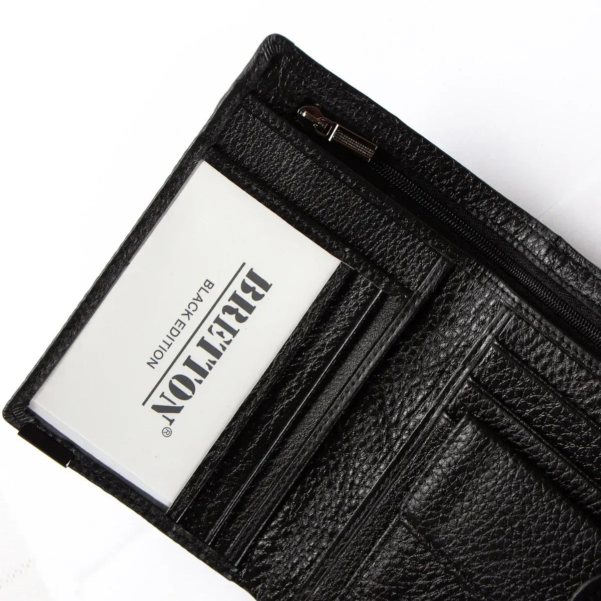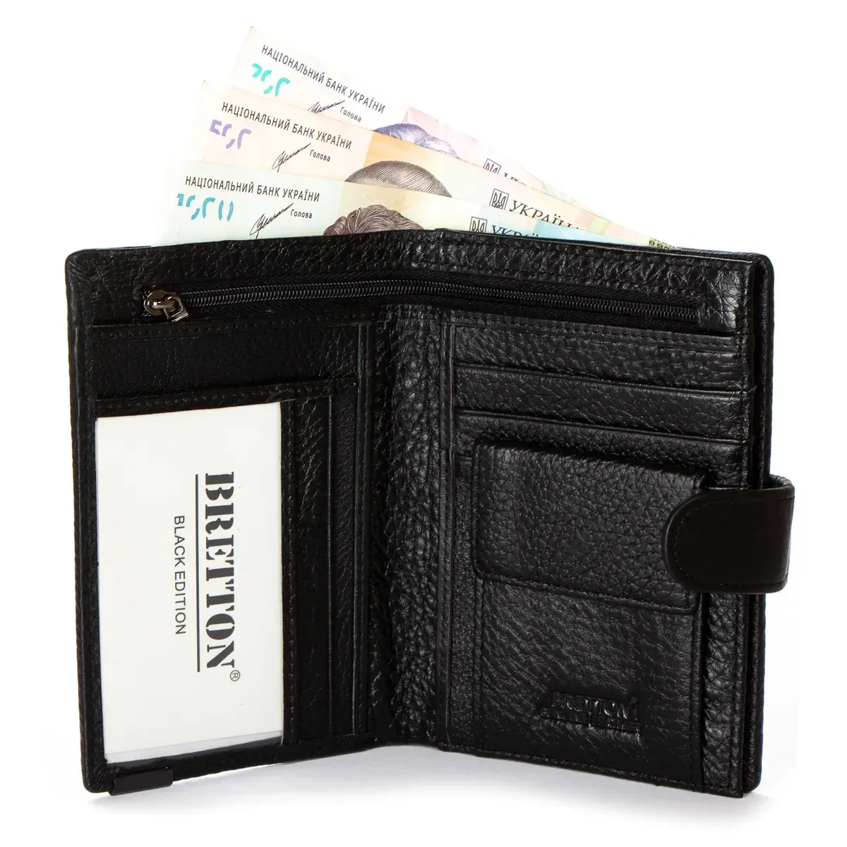 Чоловічий шкіряний гаманець Bretton, серія Black Edition. Виготовлений з м'якої натуральної шкіри. Усередині є: дві відкриті та одне на блискавці відділення для банкнот, 4 кишені для візитних карток, 3 великі кишені та монетниця на кнопці. Також у додатковому блоці є відділення для паспорта.