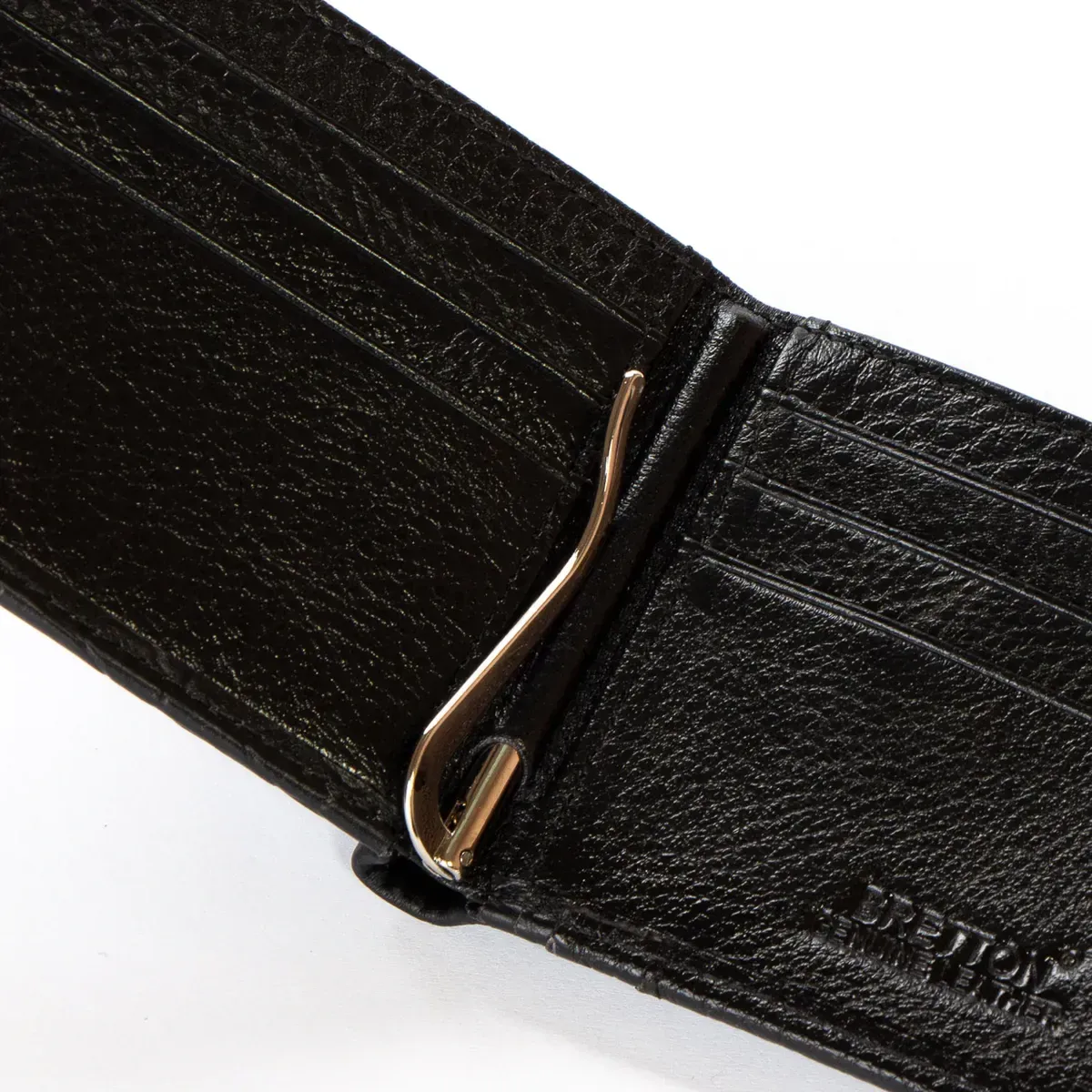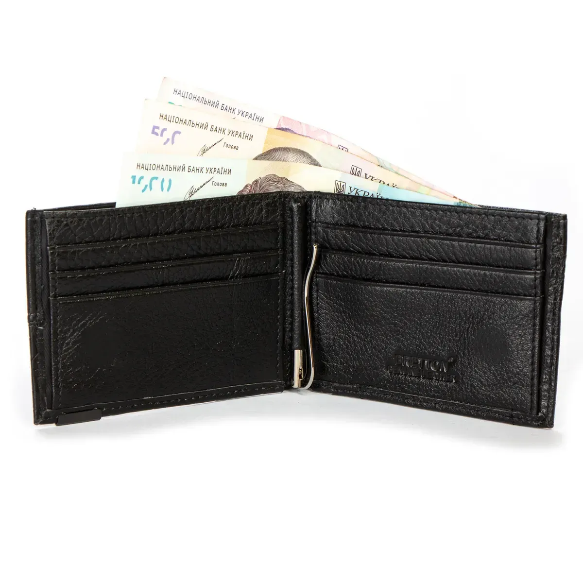 Чоловічий шкіряний гаманець із затискачем для банкнот Bretton, серія Black Edition. Виготовлений з м'якої натуральної шкіри. Усередині знаходиться одне відкрите та одне на блискавці відділення для банкнот, 6 кишень для візитних карток. Зовні на звороті є монетниця на кнопці.