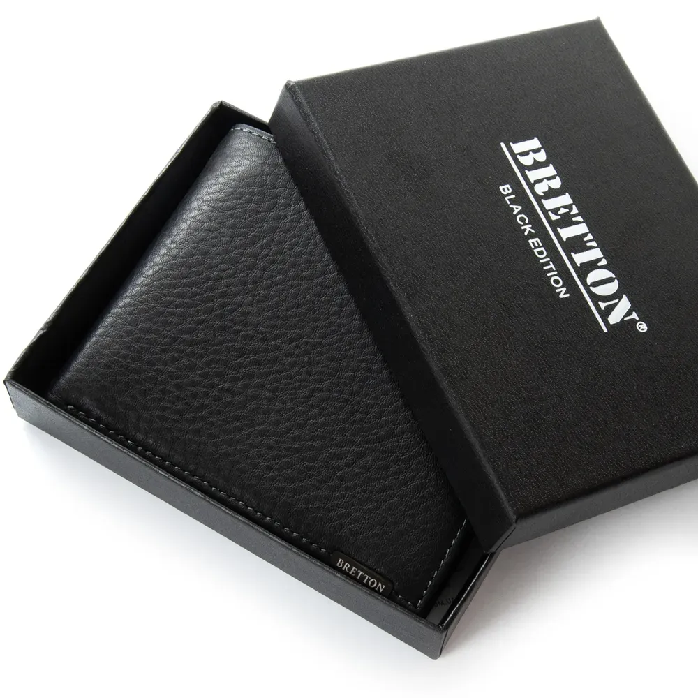 Мужской облегченный кожаный кошелек Bretton, серия Black Edition. Изготовлен из мягкой натуральной кожи. Закрывается на скрытый магнит Внутри есть два открытых и одно на молнии отделения для банкнот, 4 открытых кармана и 4 кармана для карт.