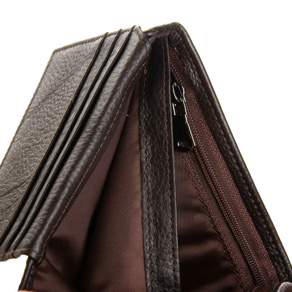 Изготовлен из мягкой натуральной кожи. Внутри есть: два открытых и одно на молнии отделения для банкнот, 7 карманов для визитных карт на откидном блоке, 2 больших кармана и монетница на кнопке.