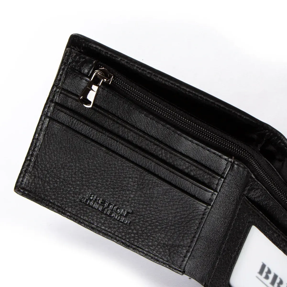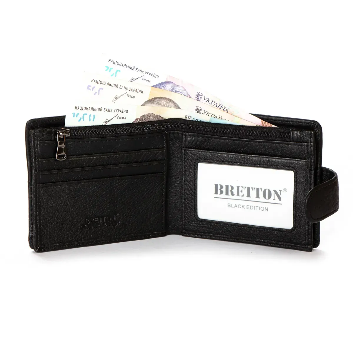 Чоловічий шкіряний гаманець Bretton, серія Black Edition. Виготовлений з м'якої натуральної шкіри. Усередині є: дві відкриті та одне на блискавці відділення для банкнот, 4 кишені для візитних карток і 2 великі кишені.