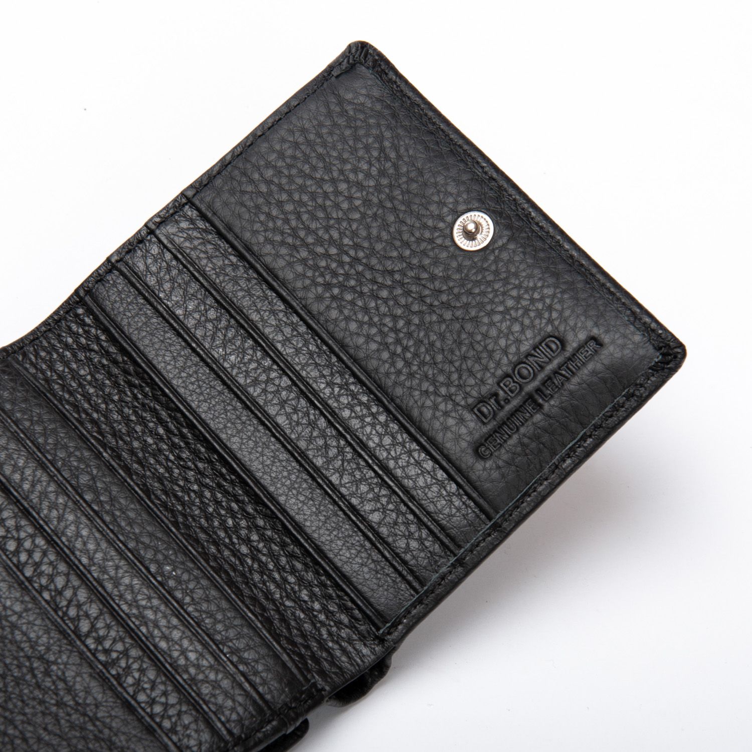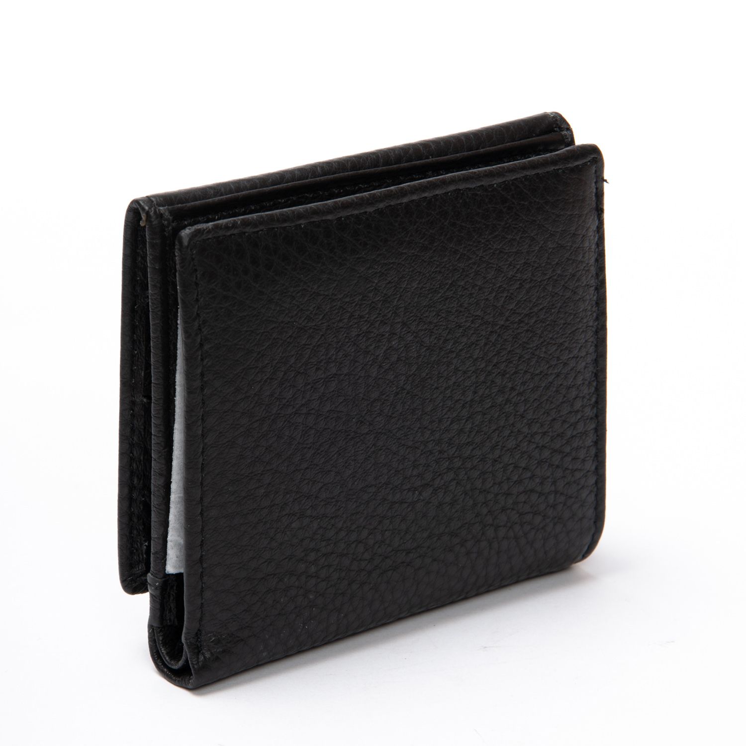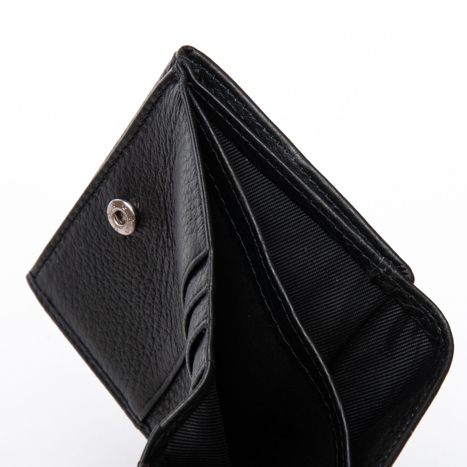 Внутри находятся два открытых отделения для банкнот (разделены кожаной перегородкой) и 8 карманов для визитных карт. Снаружи кошелька на фасаде расположена монетница под клапаном на кнопке.