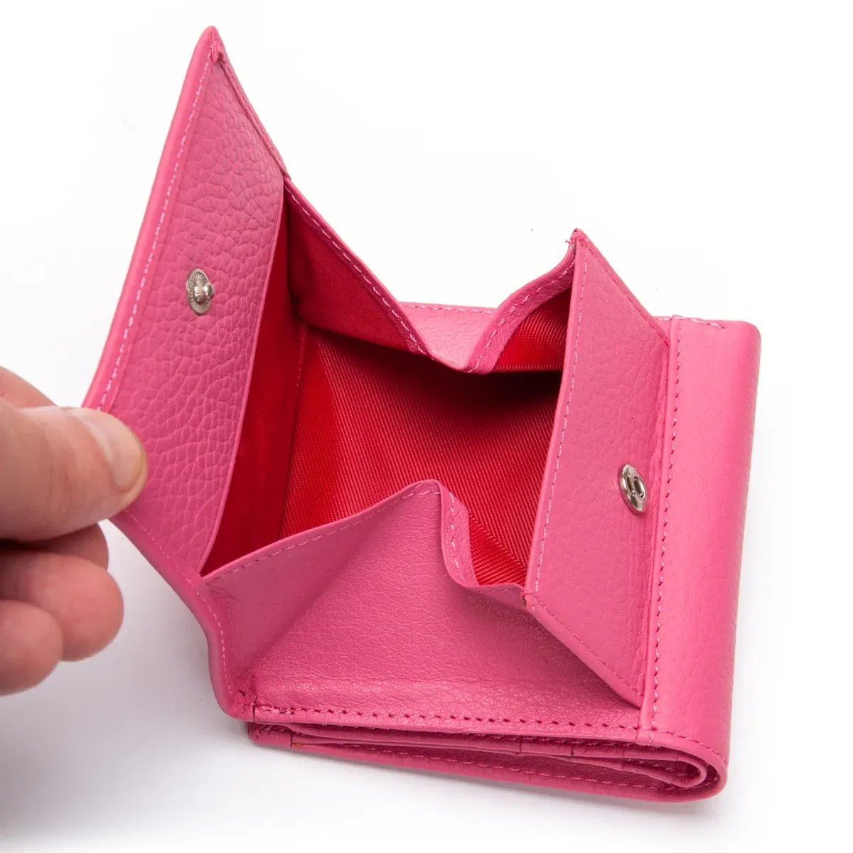 Кошелек изготовлен из натуральной мягкой кожи. Складывается вдвое и закрывается на кнопку.